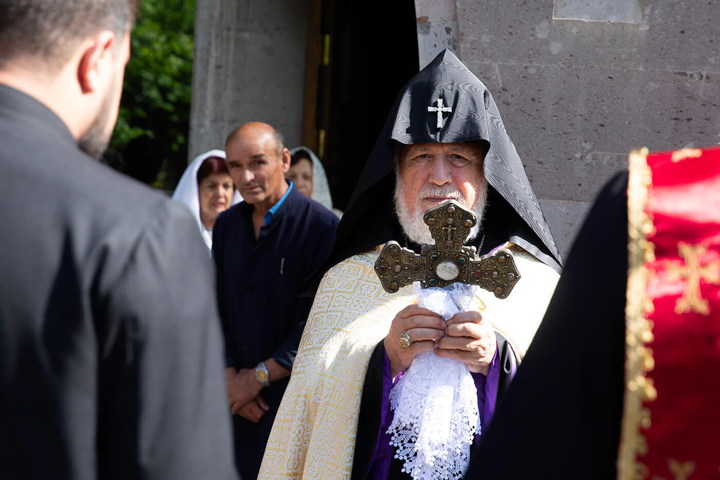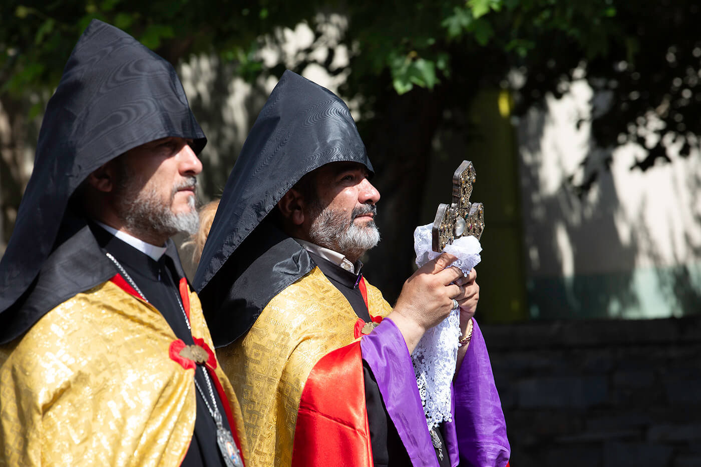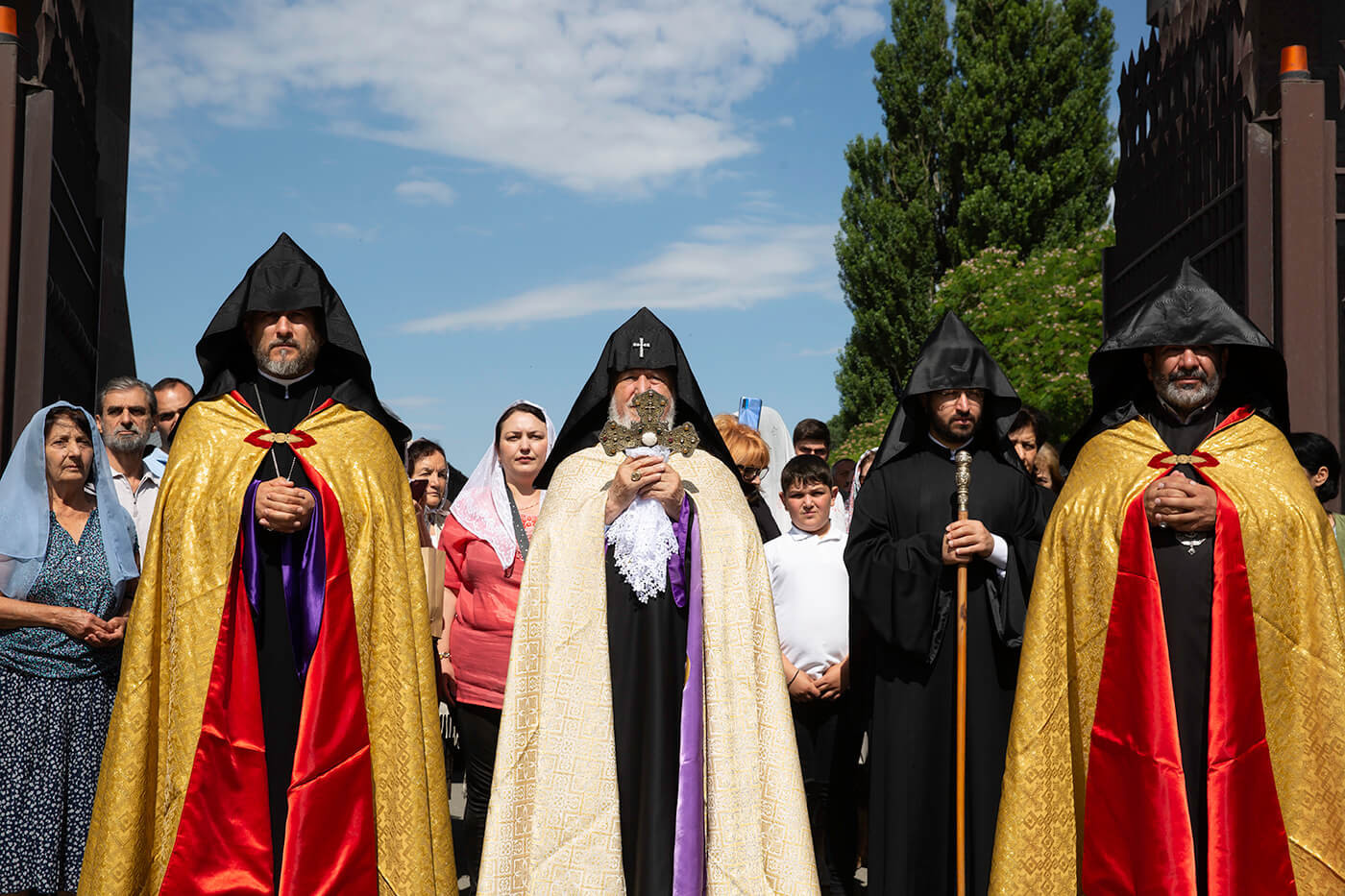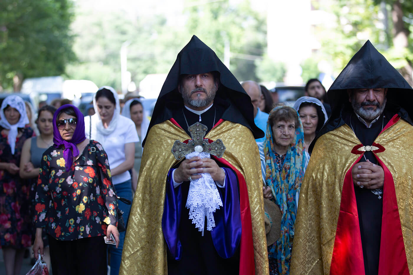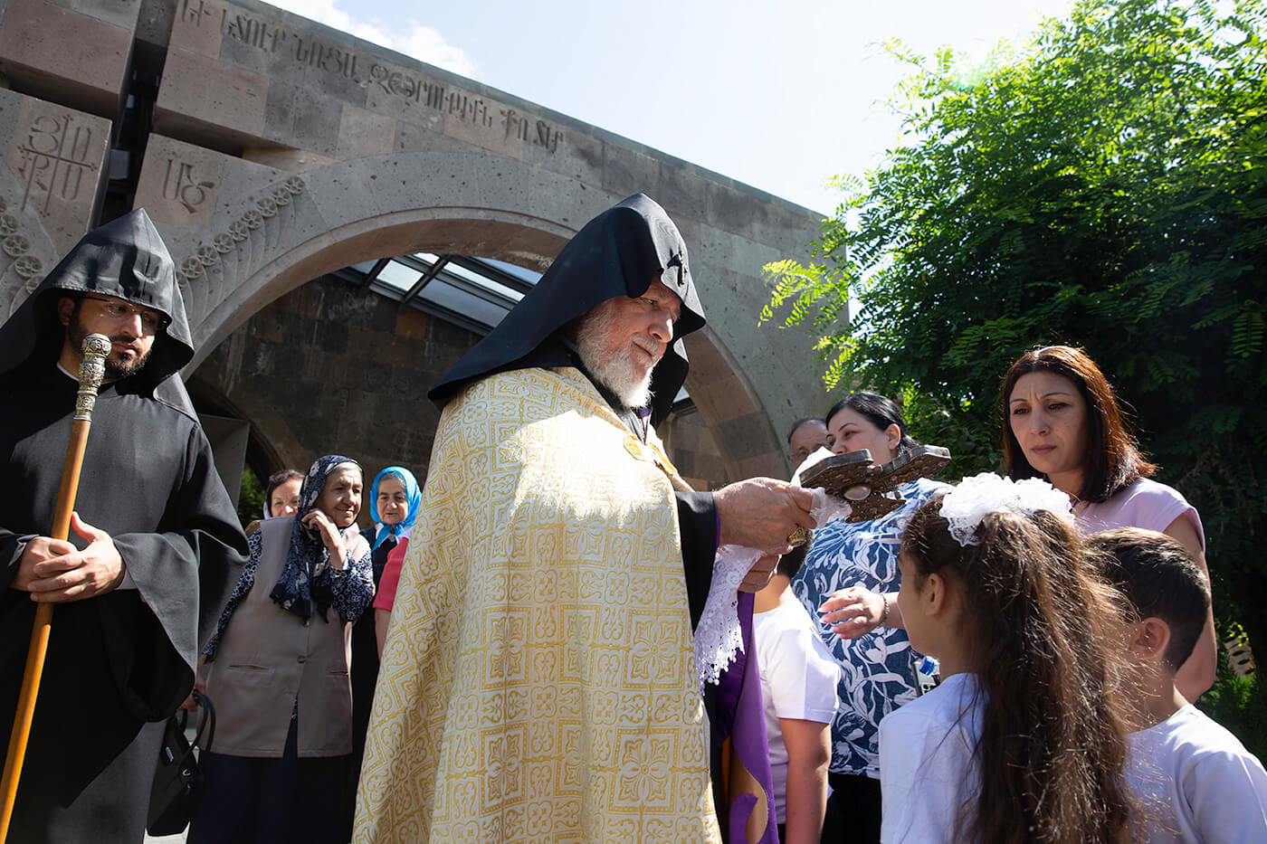 Սուրբ Շողակաթ վանքի առջև թափորը դիմավորեցին բազմաթիվ ուխտավորներ` Մայր Աթոռի Վանորեից տեսուչ Գերաշնորհ Տ. Արտակ եպիսկոպոս Տիգրանյանի գլխավորությամբ: