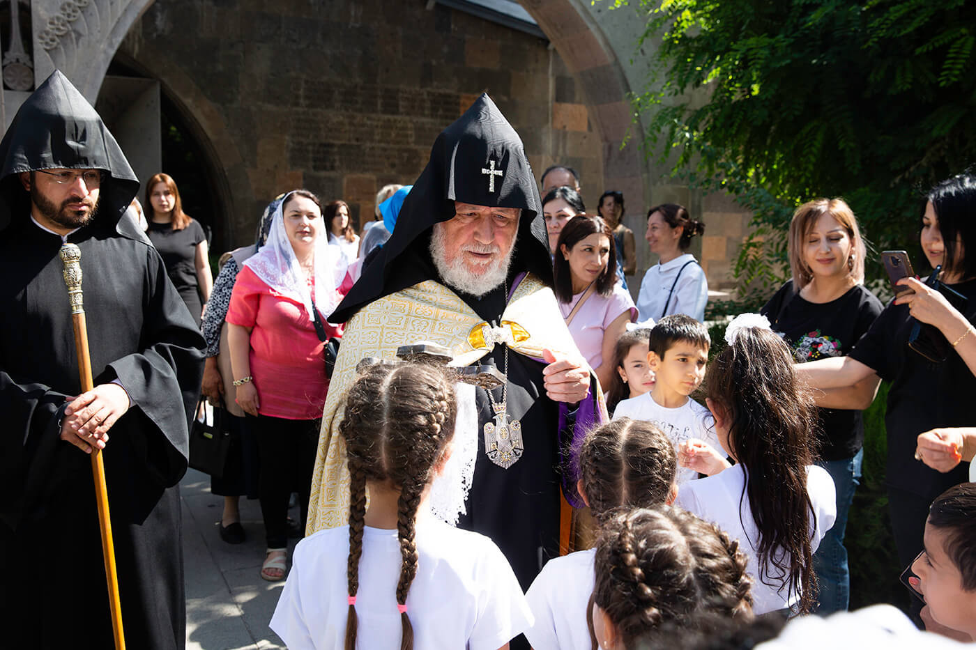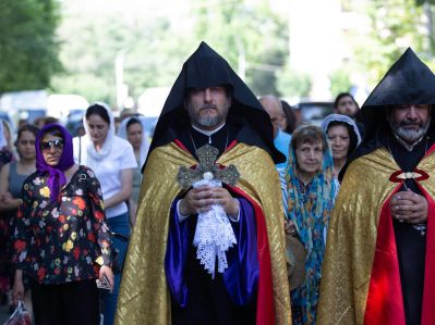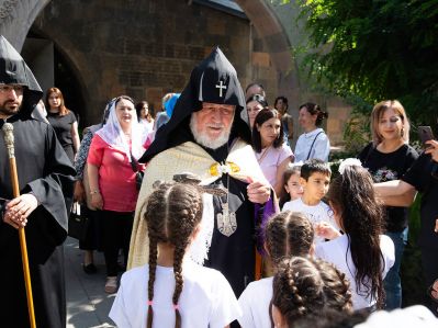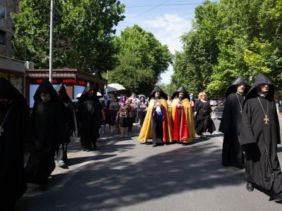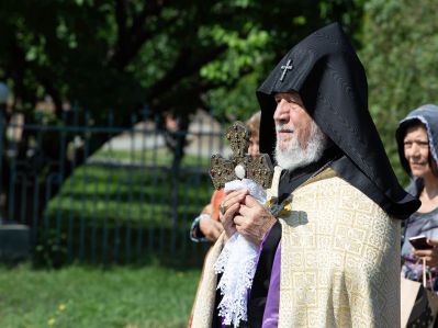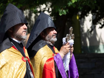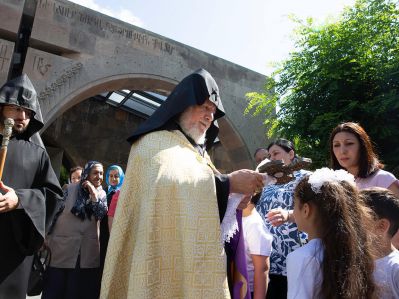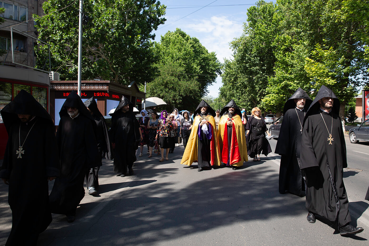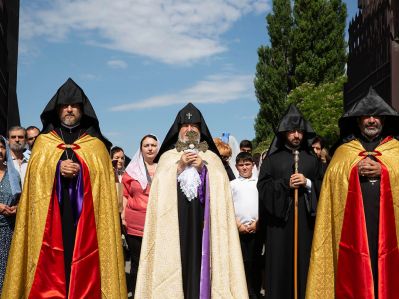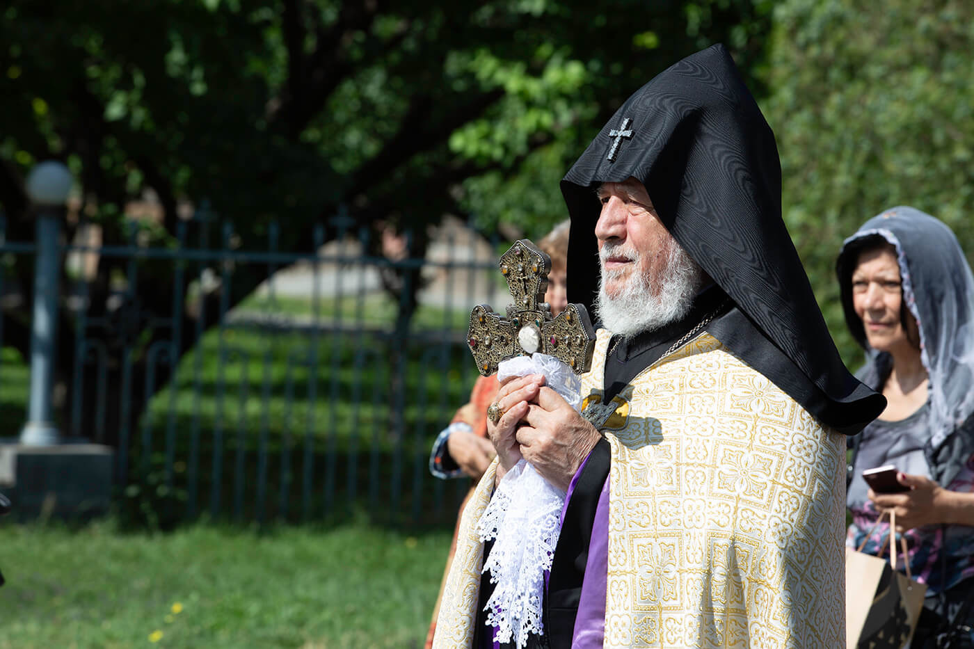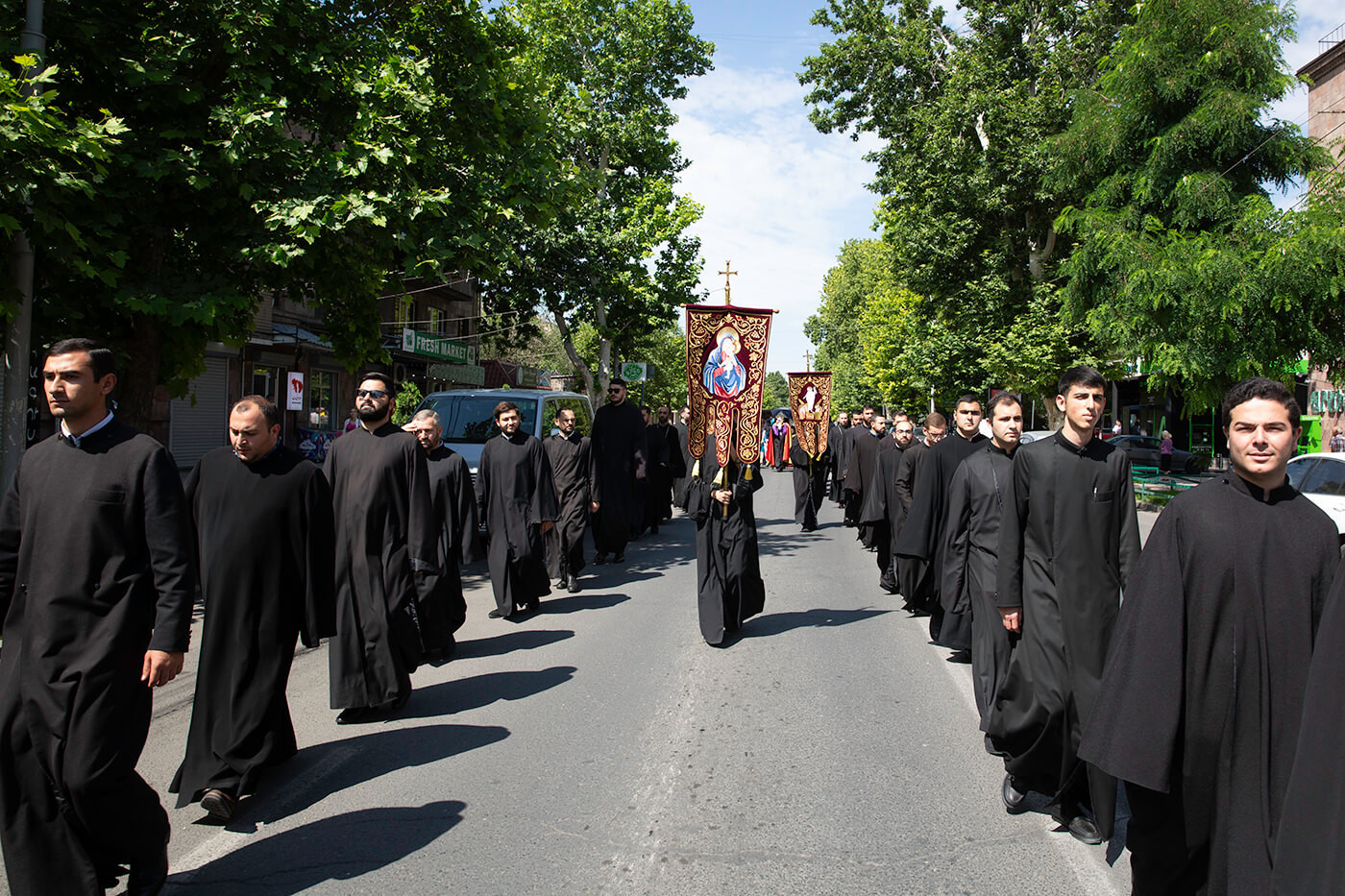 Սուրբ Շողակաթ վանքի առջև թափորը դիմավորեցին բազմաթիվ ուխտավորներ` Մայր Աթոռի Վանորեից տեսուչ Գերաշնորհ Տ. Արտակ եպիսկոպոս Տիգրանյանի գլխավորությամբ: