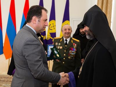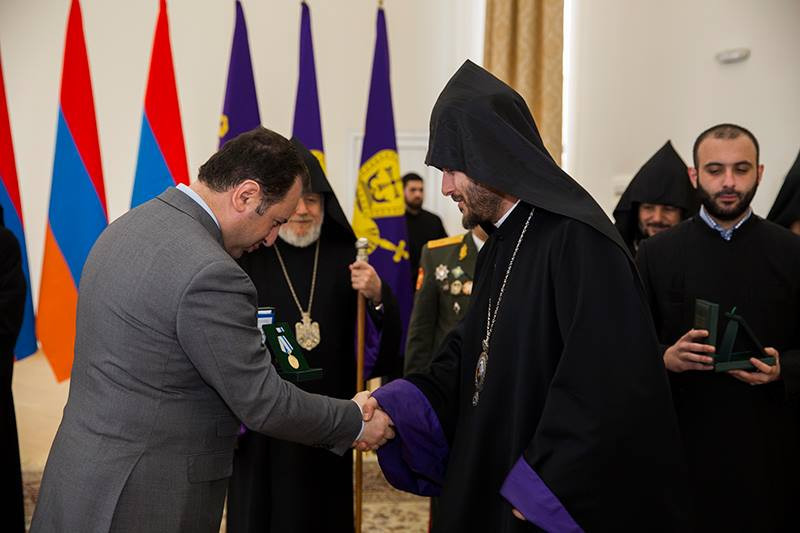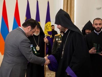 «Անդրանիկ Օզանյան» մեդալով պարգևատրվեցին Արմավիրի թեմի առաջնորդ Գերաշնորհ Տ. Սիոն եպիսկոպոս Ադամյանը, Դամասկոսի հայոց թեմի առաջնորդ Գերաշնորհ Տ. Արմաշ եպիսկոպոս Նալբանդյանը, ԵՊՀ Աստվածաբանության ֆակուլտետի դեկան, Երևանի Ս. Գրիգոր Լուսավորիչ մայր եկեղեցու հոգևոր տեսուչ Գերաշնորհ Տ. Անուշավան եպիսկոպոս Ժամկոչյանը, Վանորեից տեսուչ Գերաշնորհ Տ. Արտակ եպիսկոպոս Տիգրանյանը, Արագածոտնի թեմի առաջնորդ Գերաշնորհ Տ. Մկրտիչ եպիսկոպոս Պռոշյանը, Մեծ Բրիտանիայի և Իռլանդիայի հայոց թեմի առաջնորդ Գերաշնորհ Տ. Հովակիմ եպիսկոպոս Մանուկյանը, Մայր Աթոռ Սուրբ Էջմիածնի հոգևոր-կրթական բարձրագույն հաստատությունների վերատեսուչ Գերաշնորհ Տ. Գևորգ եպիսկոպոս Սարոյանը, Մայր Աթոռ Սուրբ Էջմիածնի Վարչա-տնտեսական բաժնի տնօրեն Գերաշնորհ Տ. Մուշեղ եպիսկոպոս Բաբայանը, Մայր Աթոռ Սուրբ Էջմիածնի լուսարարապետ Գերաշնորհ Տ. Հովնան եպիսկոպոս Հակոբյանը, Կանադայի հայոց թեմի առաջնորդ Գերաշնորհ Տ. Աբգար եպիսկոպոս Հովակիմյանը, Մայր Աթոռ Սուրբ Էջմիածնի Քրիստոնեական դաստիարակության կենտրոնի տնօրեն Գերաշնորհ Տ. Վարդան եպիսկոպոս Նավասարդյանը: «Գարեգին Նժդեհ» մեդալ հանձնվեց Սյունյաց թեմի առաջնորդական տեղապահ Հոգեշնորհ Տ. Մակար վարդապետ Հակոբյանին: