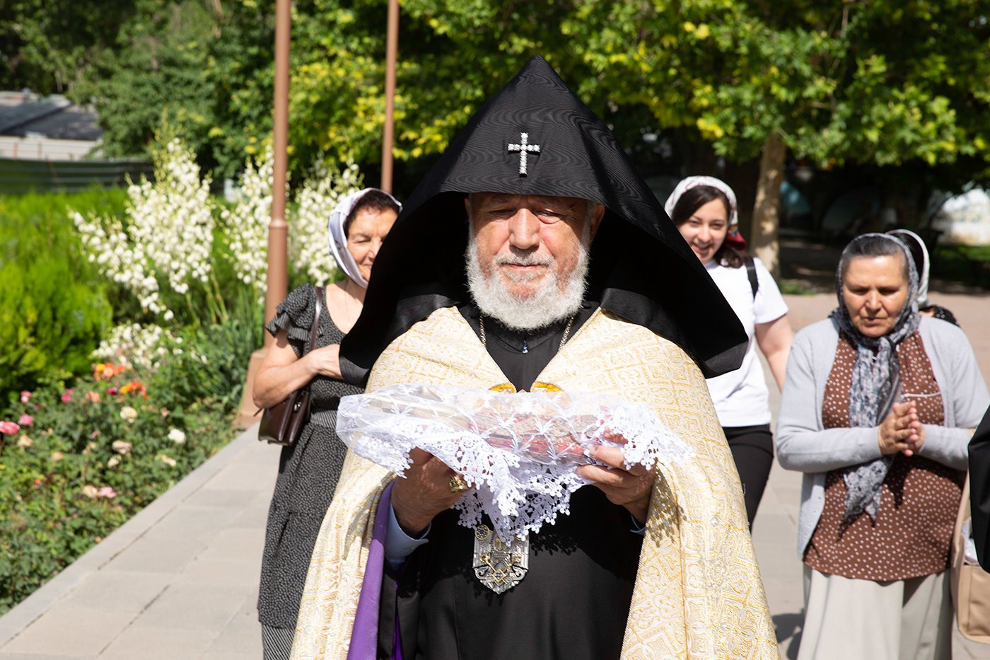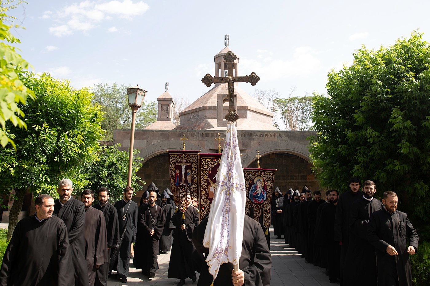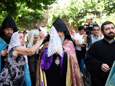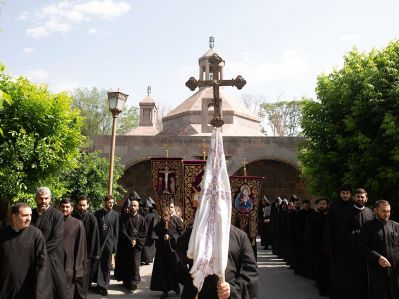 Սուրբ Հռիփսիմե վանքի առջև թափորը դիմավորեցին վանքի հոգևոր սպասավորները և տարբեր վայրերից ժամանած բազում ուխտավորներ` Մայր Աթոռ Սուրբ Էջմիածնի Վանորեից տեսուչ Գերաշնորհ Տ. Արտակ եպիսկոպոս Տիգրանյանի գլխավորությամբ: