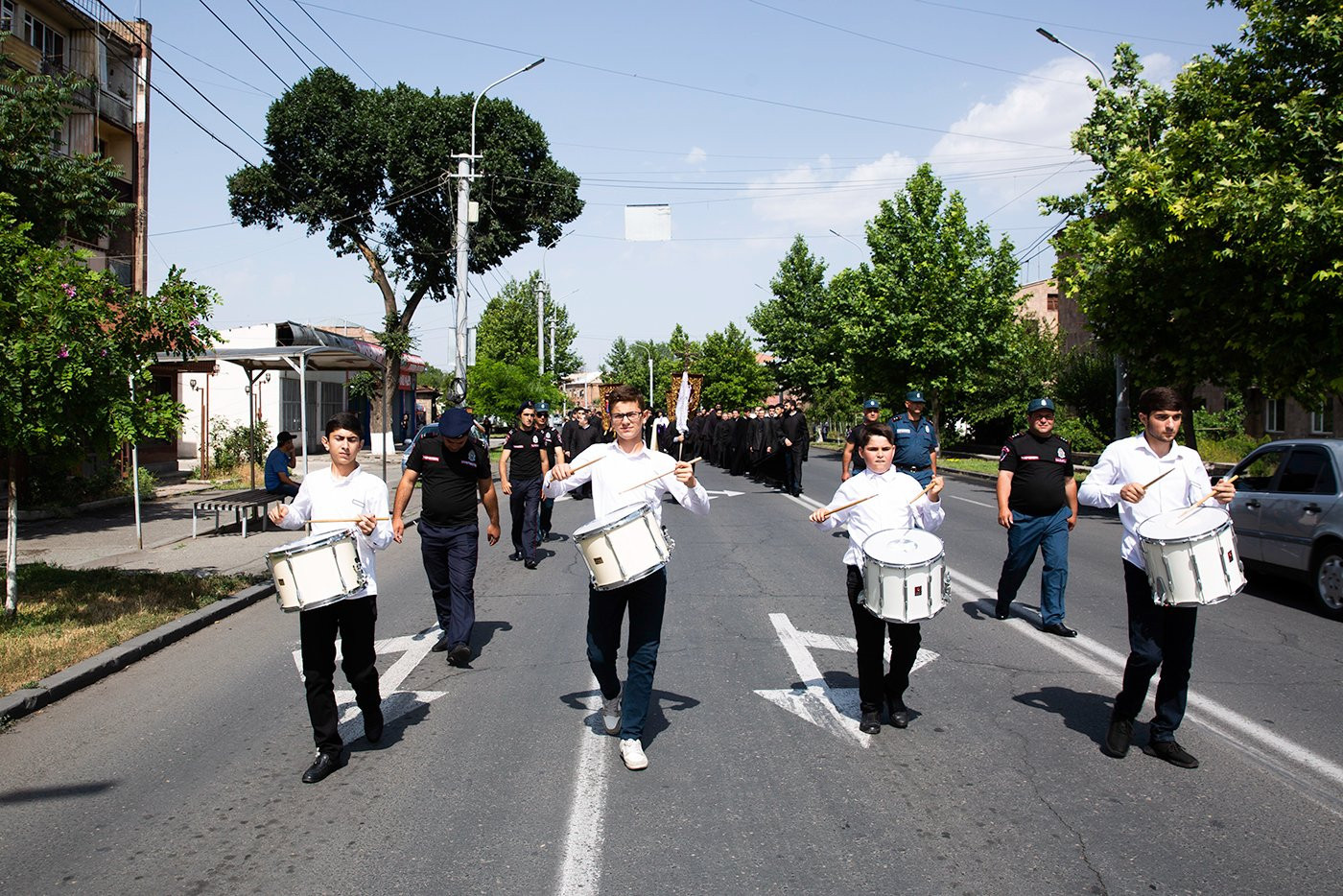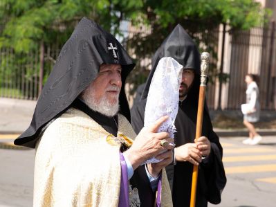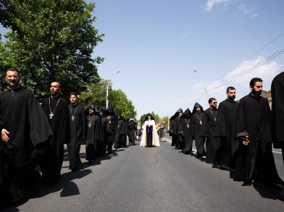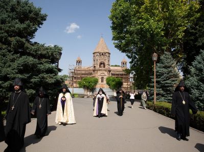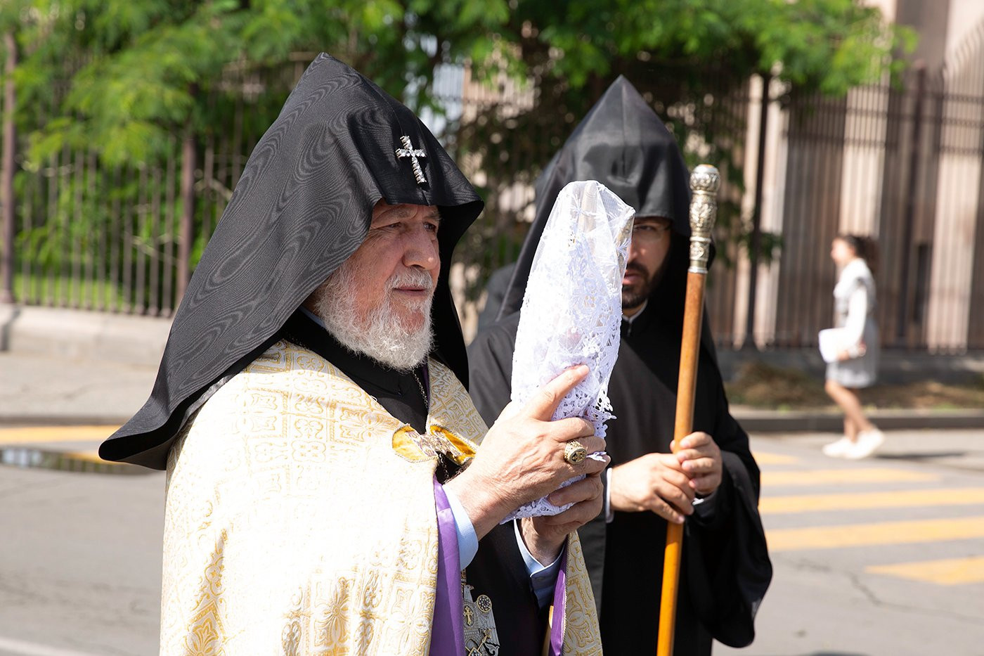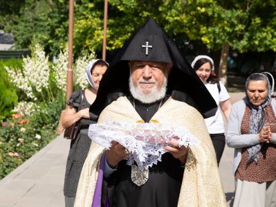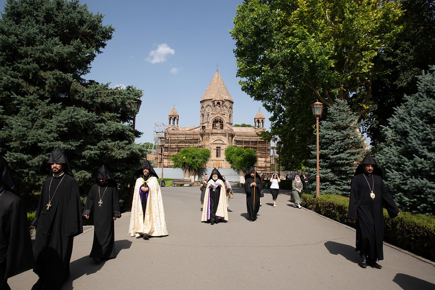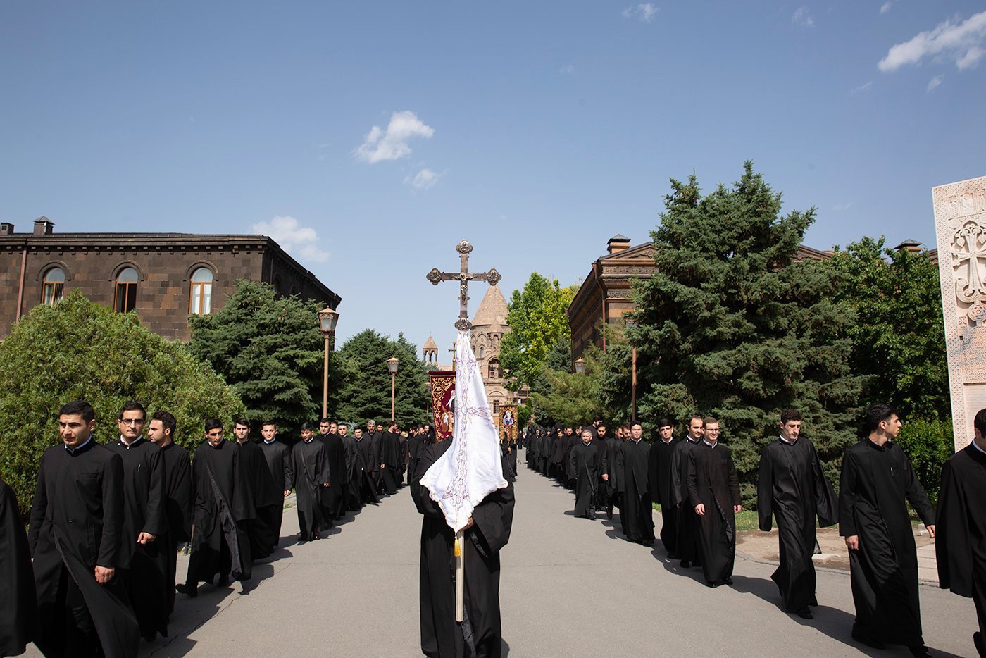 Առավոտյան Մայր Աթոռ Սուրբ Էջմիածնից եկեղեցականների թափորը հավատացյալների ուղեկցությամբ, Էջմիածնի Հայորդյաց տան սաների թմբուկների զարկերի ներքո, շարժվեց դեպի Սուրբ Հռիփսիմե վանք` տանելով սուրբ Հռիփսիմեի մասունքները: Սուրբ Գրիգոր Լուսավորչի կամարի առջև Ամենայն Հայոց Հայրապետը, սրբազան Աջով օրհնելով հոգևոր դասին և ներկա բարեպաշտ ժողովրդին, այն փոխանցեց Մայր Աթոռի լուսարարապետ Գերաշնորհ Տ. Մուշեղ եպիսկոպոս Բաբայանին: