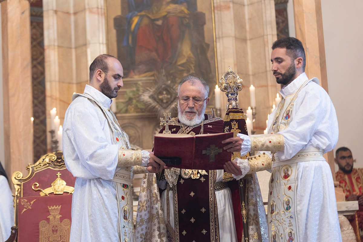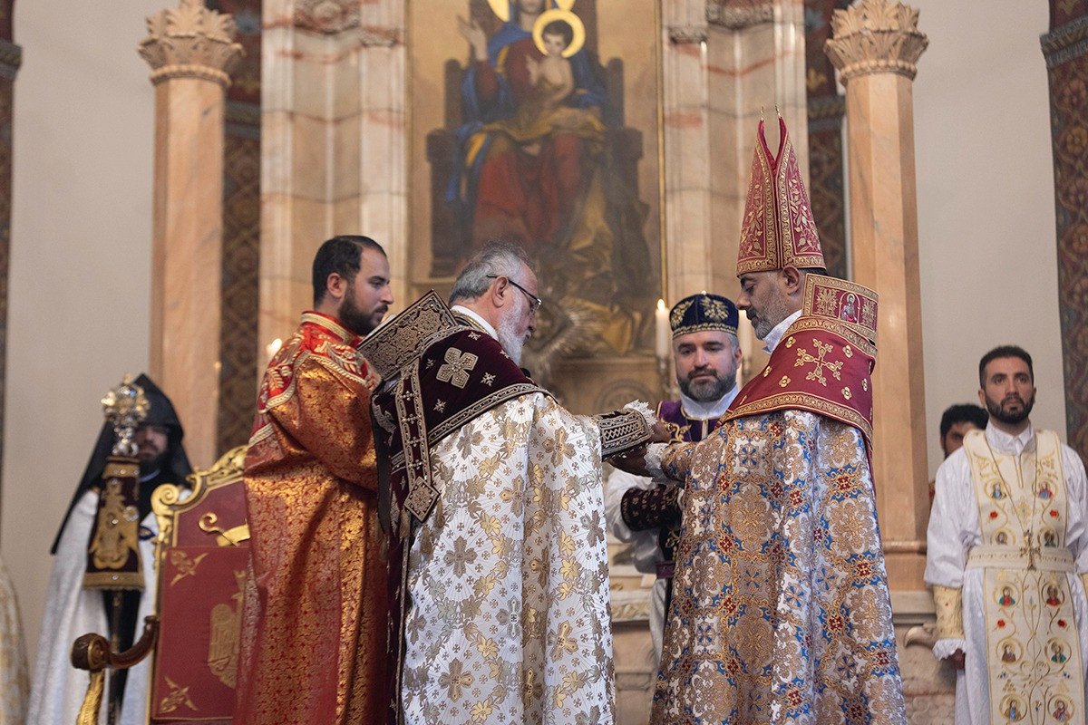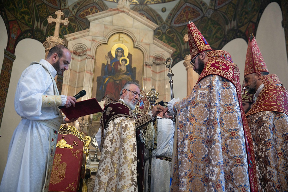 Վեհափառ Հայրապետին որպես առընթերականեր սպասավորում էին Կ․ Պոլսի Հայոց Պատրիարք Ամենապատիվ Տ․ Սահակ արքեպիսկոպոս Մաշալյանը և Մայր Աթոռ Սուրբ Էջմիածնի Արտաքին հարաբերությունների և արարողակարգի բաժնի տնօրեն Գերաշնորհ Տ. Նաթան արքեպիսկոպոս Հովհաննիսյանը։ Ընծայացուների խարտավիլակն էր ԱՄՆ Հայոց Արևելյան թեմի առաջնորդ Գերաշնորհ Տ. Մեսրոպ եպիսկոպոս Պարսամյանը։