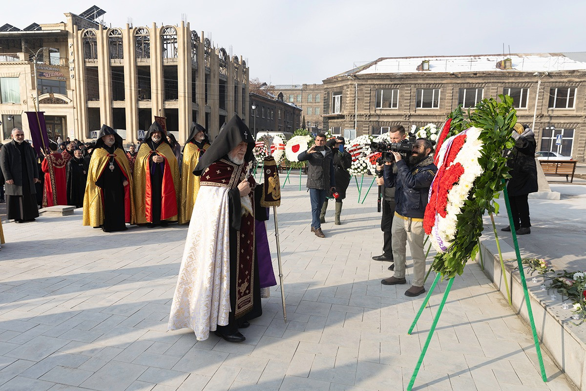 Վեհափառ Հայրապետը եկեղեցականների հանդիսավոր թափորով նախ առաջնորդվեց դեպի Սուրբ Ամենափրկիչ եկեղեցու բակում կանգնեցված երկրաշարժի զոհերին նվիրված հուշարձան, որտեղ ծաղկեպսակի զետեղումից հետո աղոթք բարձրացրեց առ Աստված անմեղ զոհերի հոգիների խաղաղության և հանգստության համար։