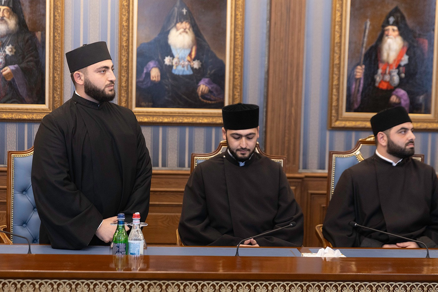 Հանդիպմանը Հայր Հարությունը Ամենայն Հայոց Կաթողիկոսին ներկայացրեց նորաօծներին՝ հայցելով Նորին Սրբության օրհնությունն ու պատգամը ձեռնադրյալներին։ Նարեկ Սրբազանն իր հերթին երախտագիտություն հայտնեց Հայոց Հովվապետին քահանայական ձեռնադրություն կատարելու պատվին արժանացնելու համար։
