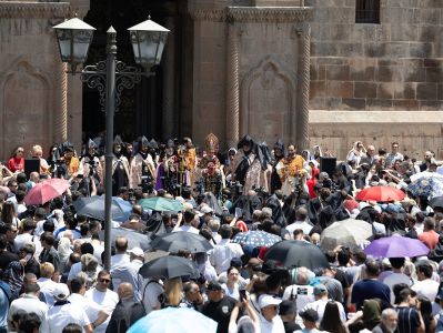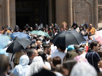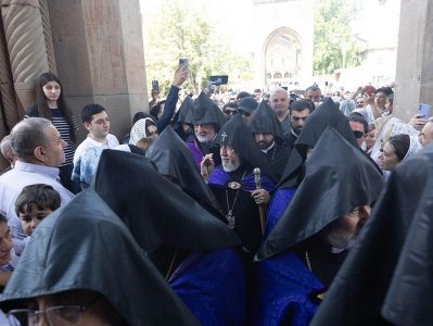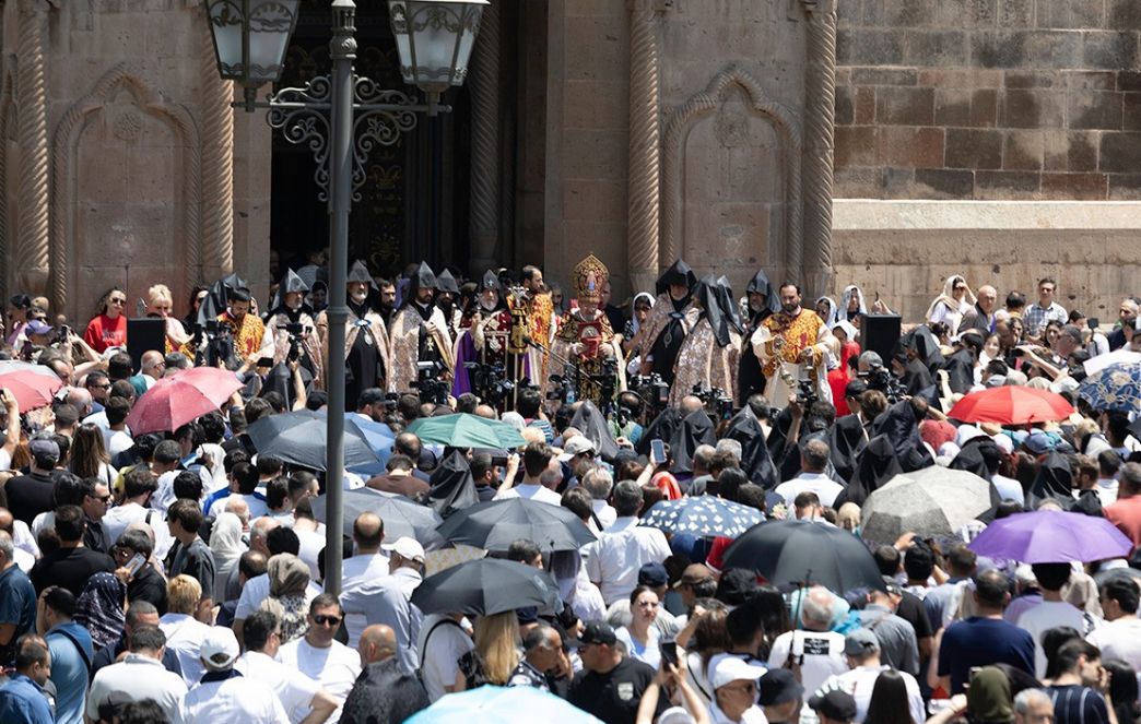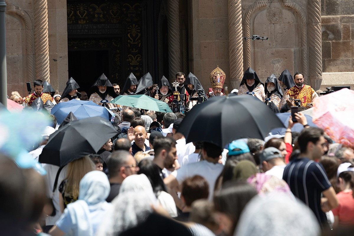 Սիրելիներ, որդիական հավատարմության զգացումներով այսօր դուք՝ որպես ուխտավոր, Մայր Աթոռ Սուրբ Էջմիածնում եք՝ օրհնություն ստանալու տոնի առիթով դուրս բերված Տերունական Սուրբ Խաչի Մասունքից, Սուրբ Գրիգոր Լուսավորչի Աջից, Սուրբ Գեղարդից և երկրպագության համար ձեզ մատուցված սրբություններից։ Այս սրբությունների հրաշագործ զորությամբ մեր բարդ ու վտանգաշատ ժամանակներում փորձությունների մեջ մխիթարություն պիտի գտնենք, ուժ առնենք նեղությունները դիմագրավելու, բարօր կյանք ու լուսավոր ապագա կերտելու։