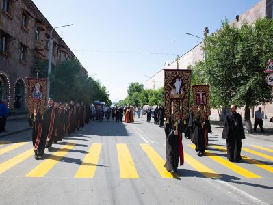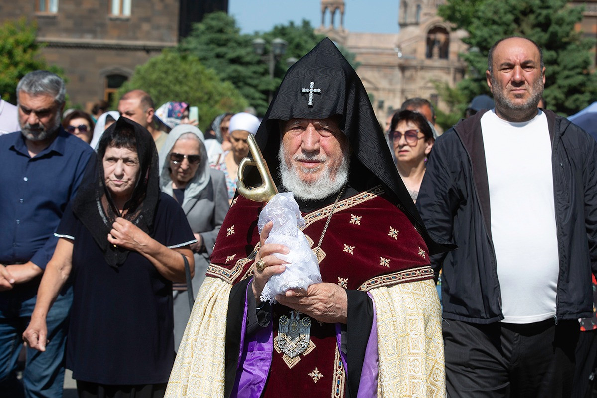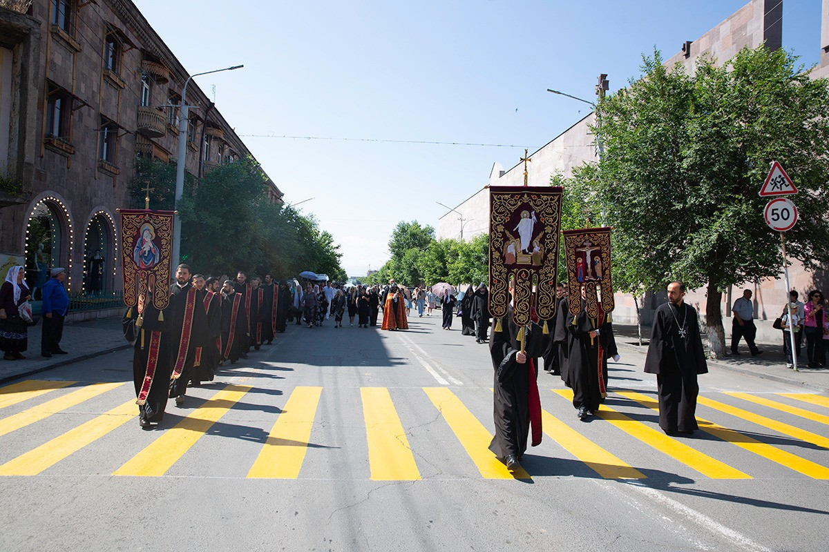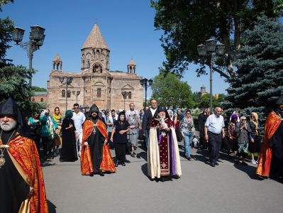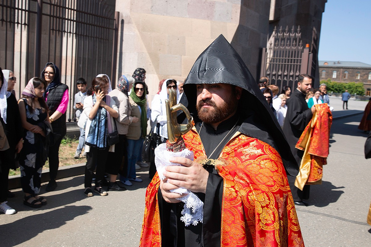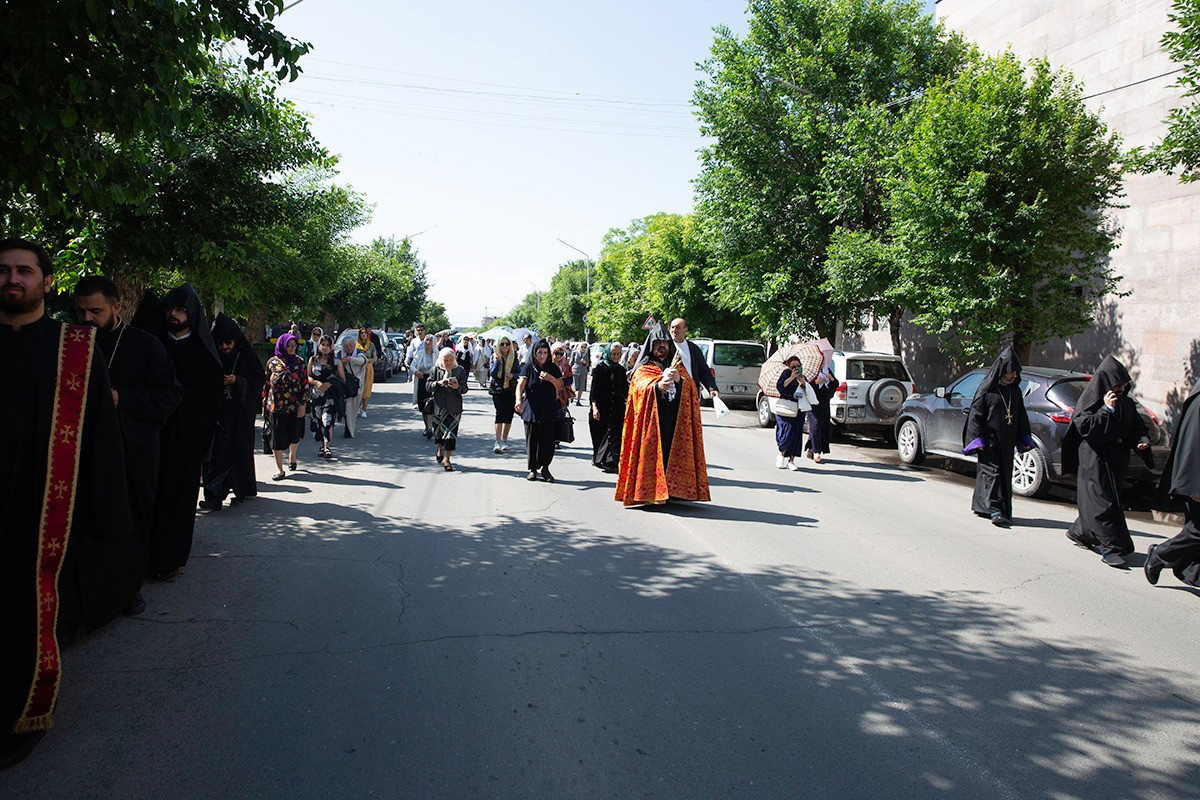 Առավոտյան Մայր Աթոռ Սուրբ Էջմիածնից եկեղեցականների թափորը հավատացյալների ուղեկցությամբ, Էջմիածնի Հայորդյաց տան սաների թմբուկների զարկերի ներքո, շարժվեց դեպի Սուրբ Հռիփսիմե վանք` տանելով սուրբ Հռիփսիմեի մասունքները: Սուրբ Գրիգոր Լուսավորչի կամարի առջև Ամենայն Հայոց Հայրապետը, սրբազան Աջով օրհնելով հոգևոր դասին և ներկա բարեպաշտ ժողովրդին, այն փոխանցեց Մայր Աթոռի լուսարարապետի պաշտոնակատար Հոգեշնորհ Տ. Հարություն վարդապետ Կիրակոսյանին: