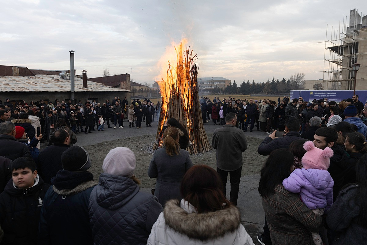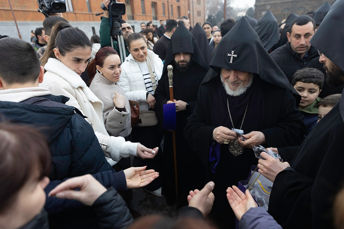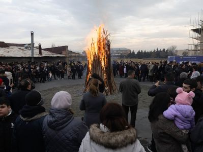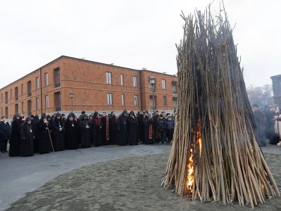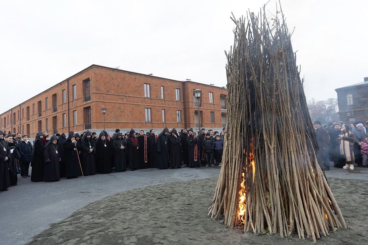 Արարողության ավարտին եկեղեցականաց թափորն ուղղվեց դեպի Մայր Աթոռի միաբանական շենքի շրջափակ, ուր ներկայությամբ բազում հավատավոր հայորդիների, Ամենայն Հայոց Հովվապետի ձեռամբ վառվեց Տեառնընդառաջի խարույկը: Վեհափառ Հայրապետը նաև հավատավոր հայորդիներին ընծայեց խաչեր: