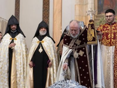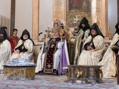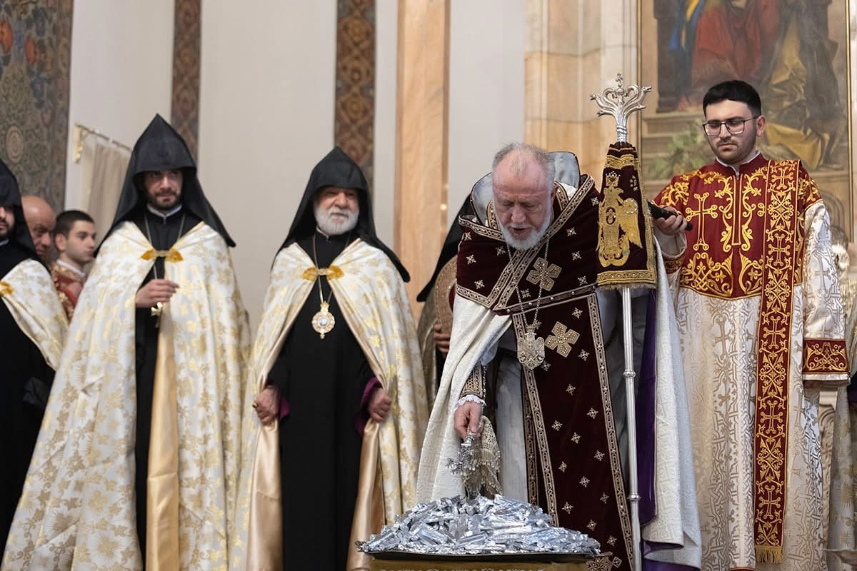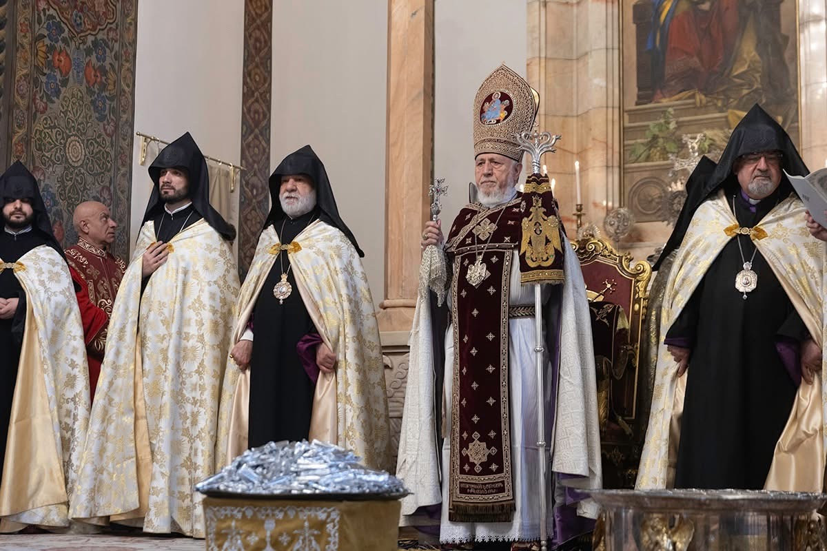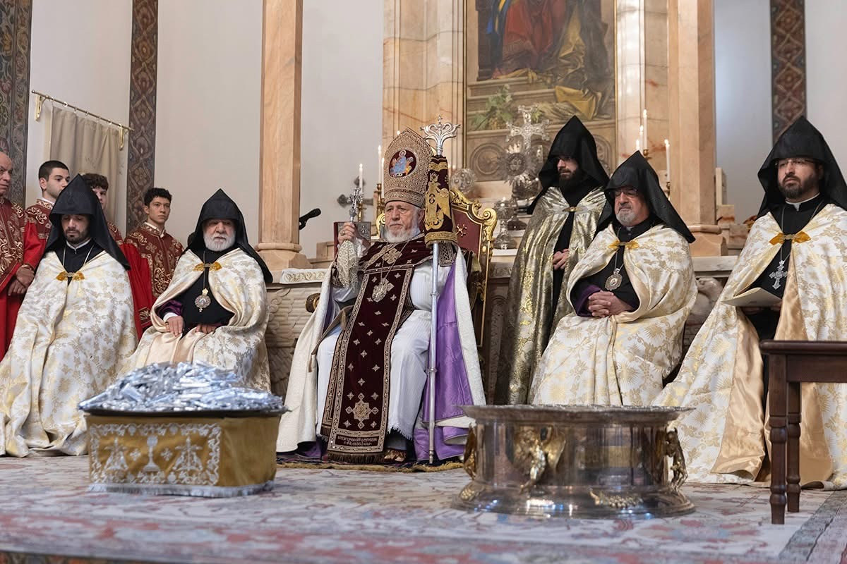 Սրբազան արարողության ընթացքում՝ սուրբգրային ընթերցումներից հետո, Ամենայն Հայոց Կաթողիկոսն օրհնեց խորանի վրա դրված ջուրն ու յուղը։