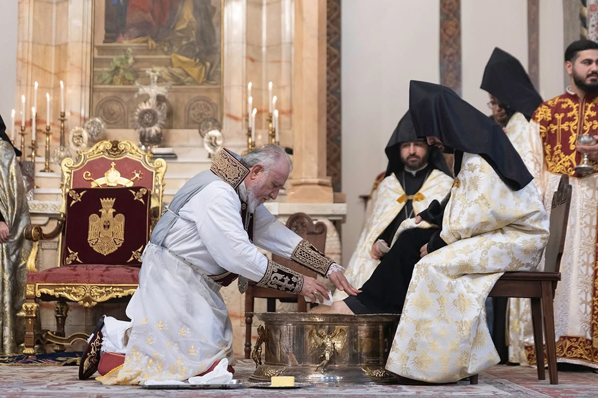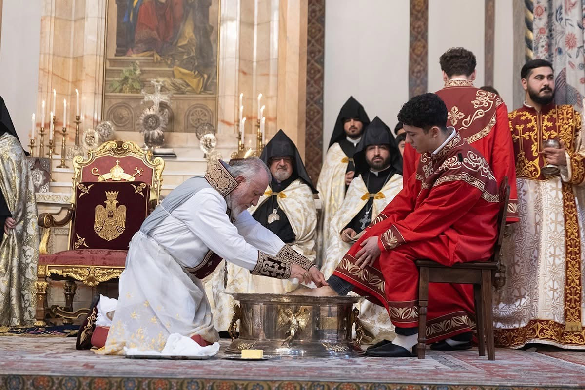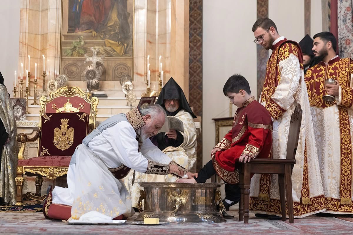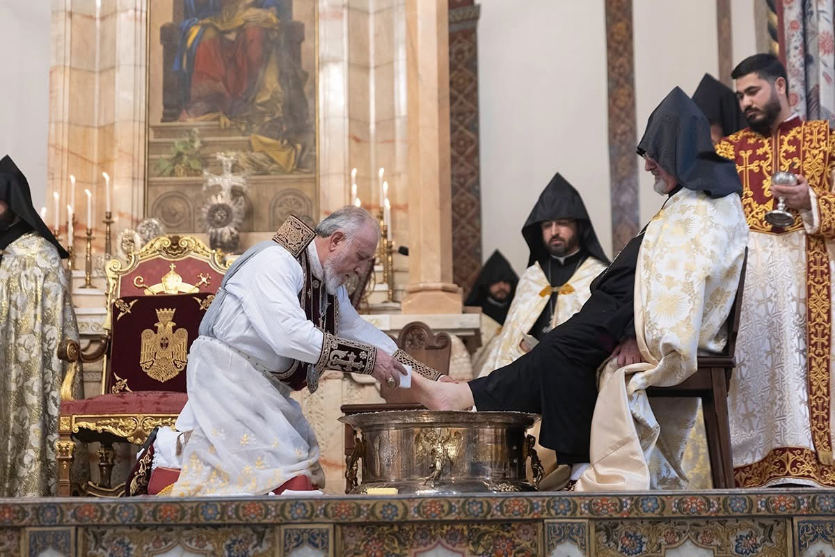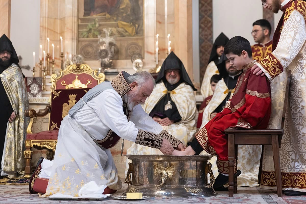 Ապա շարականների երգեցողության ներքո, Աստվածորդու օրինակով Նորին Սրբությունը ծնրադիր լվաց և յուղով օծեց Մայր Աթոռի միաբաններ՝ Տ. Հայկազուն արեպիսկոպոս Նաջարյանի, Տ․ Հովհաննես աբեղա Թորգոմյանի, Տ․ Մաշտոց աբեղա Մխիթարյանի, Արամայիս սարկավագ Ազիզյանի, Սերգեյ սարկավագ Բարսեղյանի, Սևանի Վազգենյան Հոգևոր Դպրանոցի Ե լսարանի սան Ալեն ուրարակիր Իսրայելյանի և Ա լսարանի սան Աբրահամ Հովհաննիսյանի, «Էօրնեկյան» հանրակրթական դպրոցի աշակերտներ Արտաշես Ղազարյանի, Կամսար Մարտիրոսյանի, ինչպես նաև Հայաստանի և սփյուռքի տարբեր համայնքներից հայորդիներ Վահագն Սահակյանի, Մոնթե Լևոն և Սերոբ Իշխան Եգիներյանների, Նարեկ Ղևոնդյանի, Դավիթ Մարտիրոսյանի, Ստեփան Սկրտչյանի, Նարեկ Տերտերյանի, Սարգիս Քոչարյանի և Լևոն Շարոյանի ոտքերը։