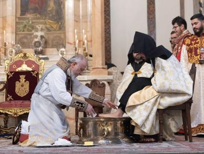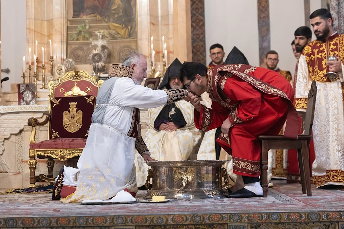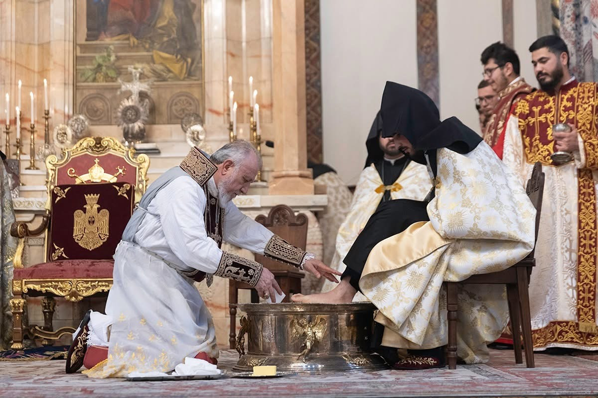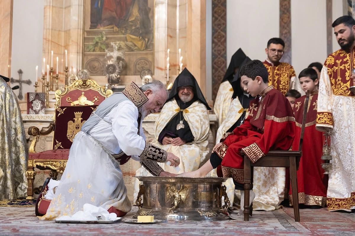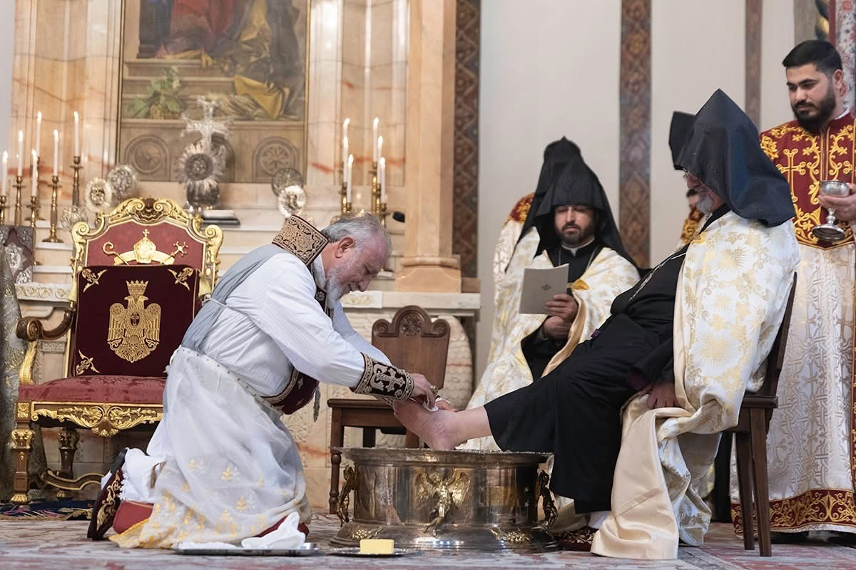 Ապա շարականների երգեցողության ներքո, Աստվածորդու օրինակով Նորին Սրբությունը ծնրադիր լվաց և յուղով օծեց Մայր Աթոռի միաբաններ՝ Տ. Հայկազուն արեպիսկոպոս Նաջարյանի, Տ․ Հովհաննես աբեղա Թորգոմյանի, Տ․ Մաշտոց աբեղա Մխիթարյանի, Արամայիս սարկավագ Ազիզյանի, Սերգեյ սարկավագ Բարսեղյանի, Սևանի Վազգենյան Հոգևոր Դպրանոցի Ե լսարանի սան Ալեն ուրարակիր Իսրայելյանի և Ա լսարանի սան Աբրահամ Հովհաննիսյանի, «Էօրնեկյան» հանրակրթական դպրոցի աշակերտներ Արտաշես Ղազարյանի, Կամսար Մարտիրոսյանի, ինչպես նաև Հայաստանի և սփյուռքի տարբեր համայնքներից հայորդիներ Վահագն Սահակյանի, Մոնթե Լևոն և Սերոբ Իշխան Եգիներյանների, Նարեկ Ղևոնդյանի, Դավիթ Մարտիրոսյանի, Ստեփան Սկրտչյանի, Նարեկ Տերտերյանի, Սարգիս Քոչարյանի և Լևոն Շարոյանի ոտքերը։