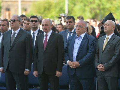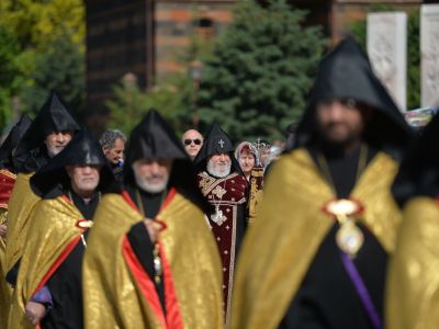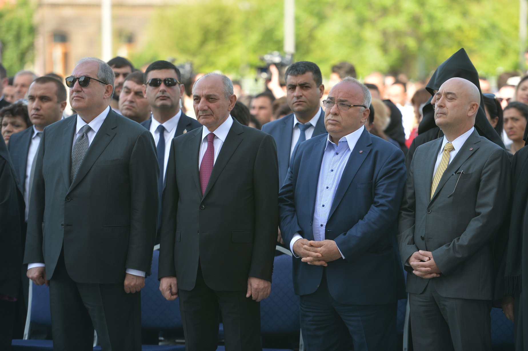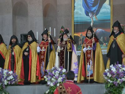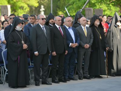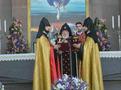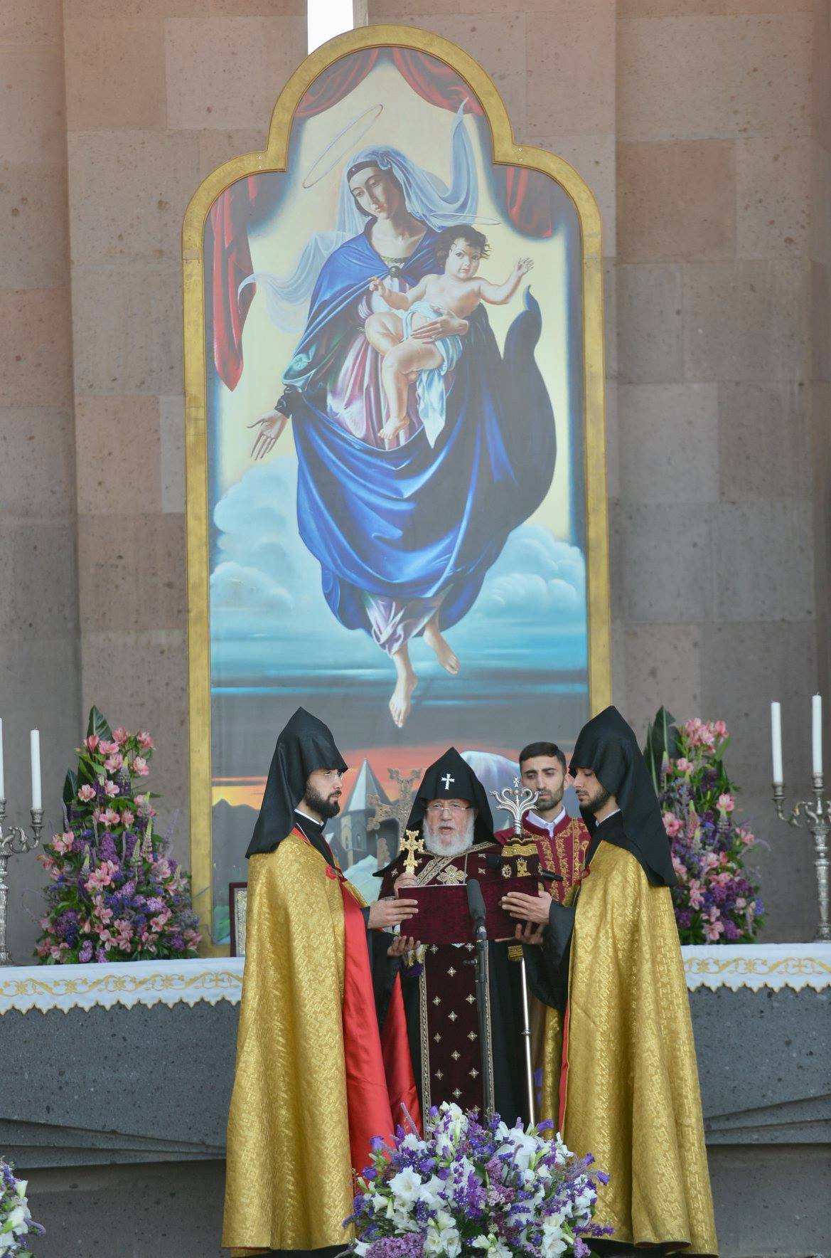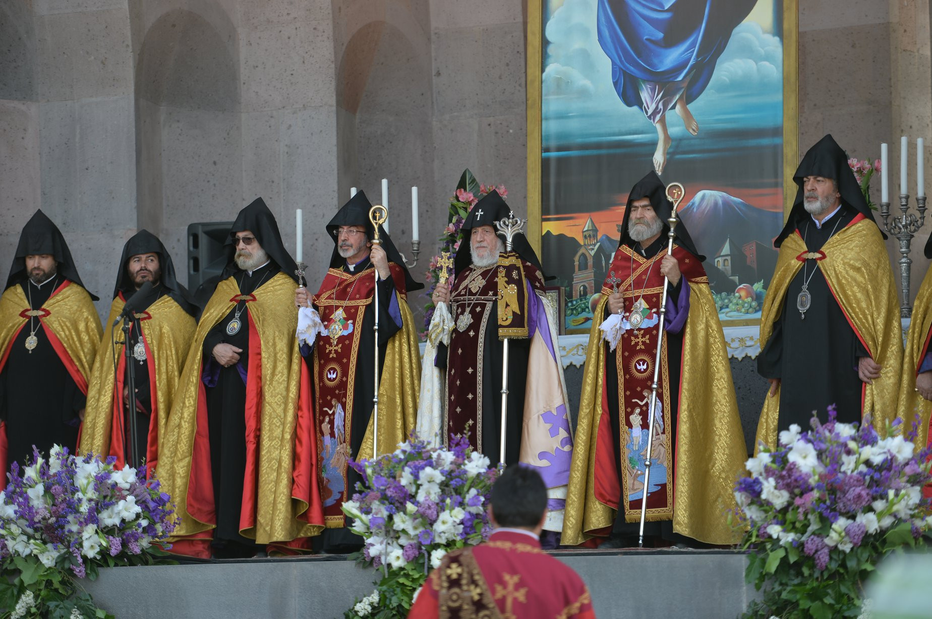 Под благозвон колоколов торжественная процессия из кафедрального собора сопроводила Католикоса Всех Армян Гарегина Второго к Открытому Алтарю, где начался Благодарственный молебен. Католикос Всех Армян коленопреклоненно помолился за мир и непоколебимость Республики Армения.