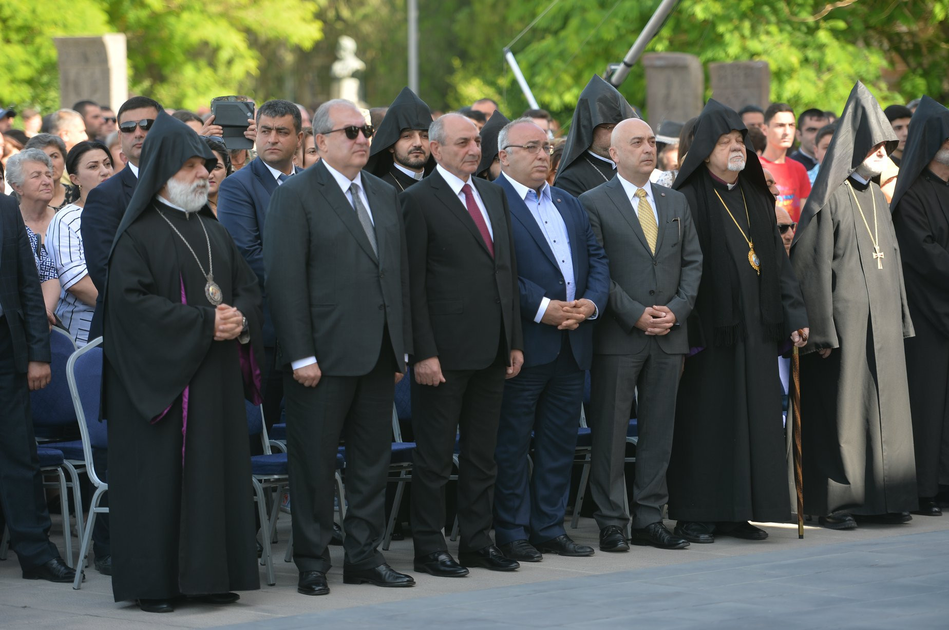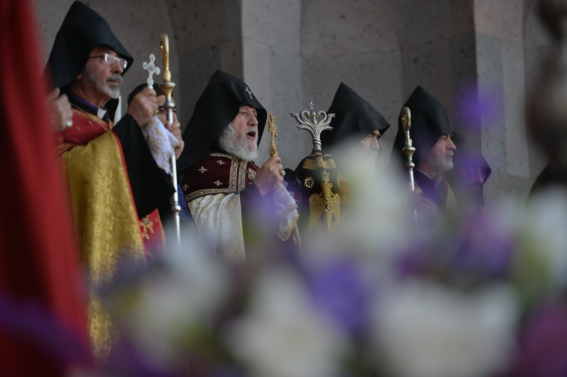 Мы собрались в этой заветной святыне Сошествия единородного в связи со 100-летним юбилеем Республики Армения и майских героических сражений, которые наш народ вел, единодушно защищая нашу заветную родину. Мы вознесли совместную молитву, возблагодарив Бога за то, что даровал нам победу Господом нашим Иисусом Христом, и испросив Всевышнего даровать мир нашей стране, непоколебимость нашему государству, благоденствие нашему народу. Испросили помощи Господа, чтобы духом согласия и братской любви смогли преодолеть жизненные проблемы и императивы. Сегодня, дорогие, взываем к памяти майских героических сражений и утверждения Первой Республики Армения, осознавая с какой силой любови к Богу и родине наш народ спас свою страну в стремлении свободно и безопасно жить на своей родине.
