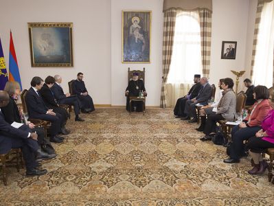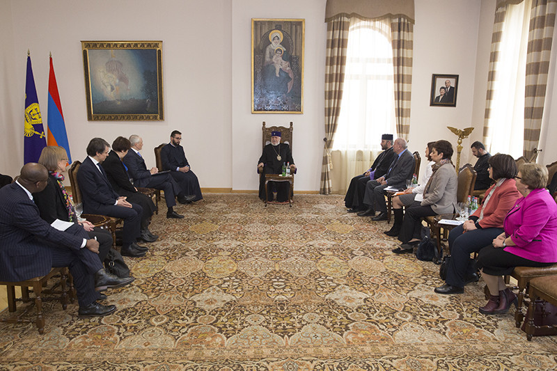 В начале встречи Карен Назарян представил Его Святейшеству возглавляемую Шомби Шарпом делегацию, коснувшись в честности перспектив сотрудничества офиса ООН с Первопрестольным Святым Эчмиадзином и Фондом «Круглый стол».