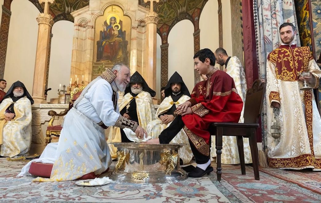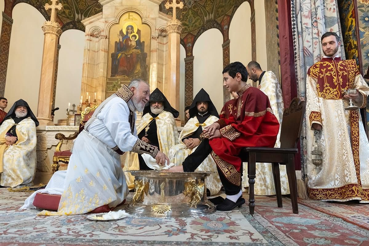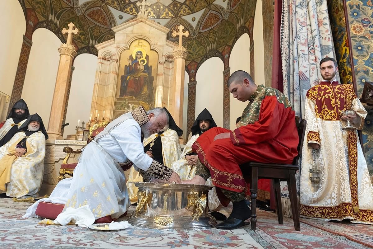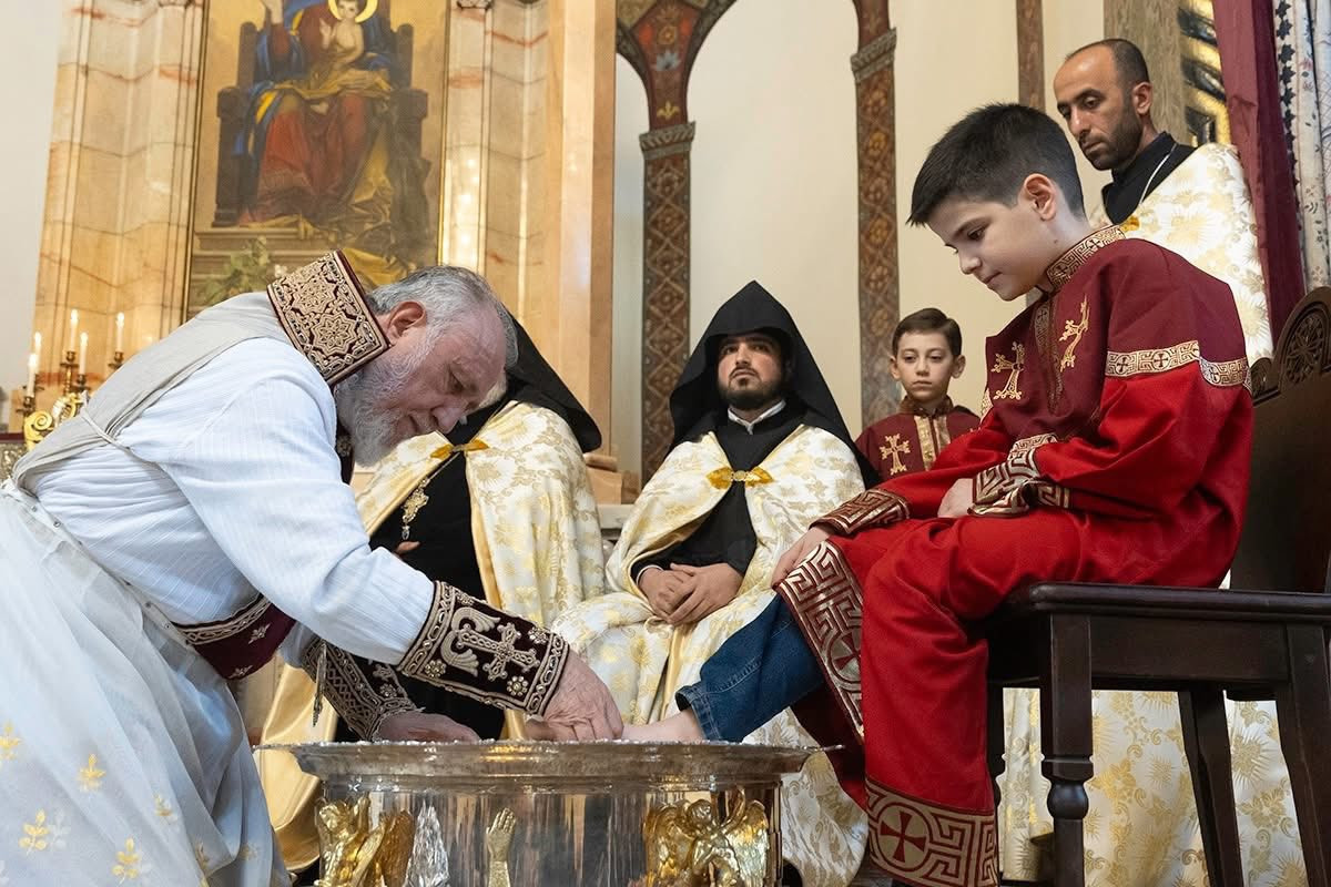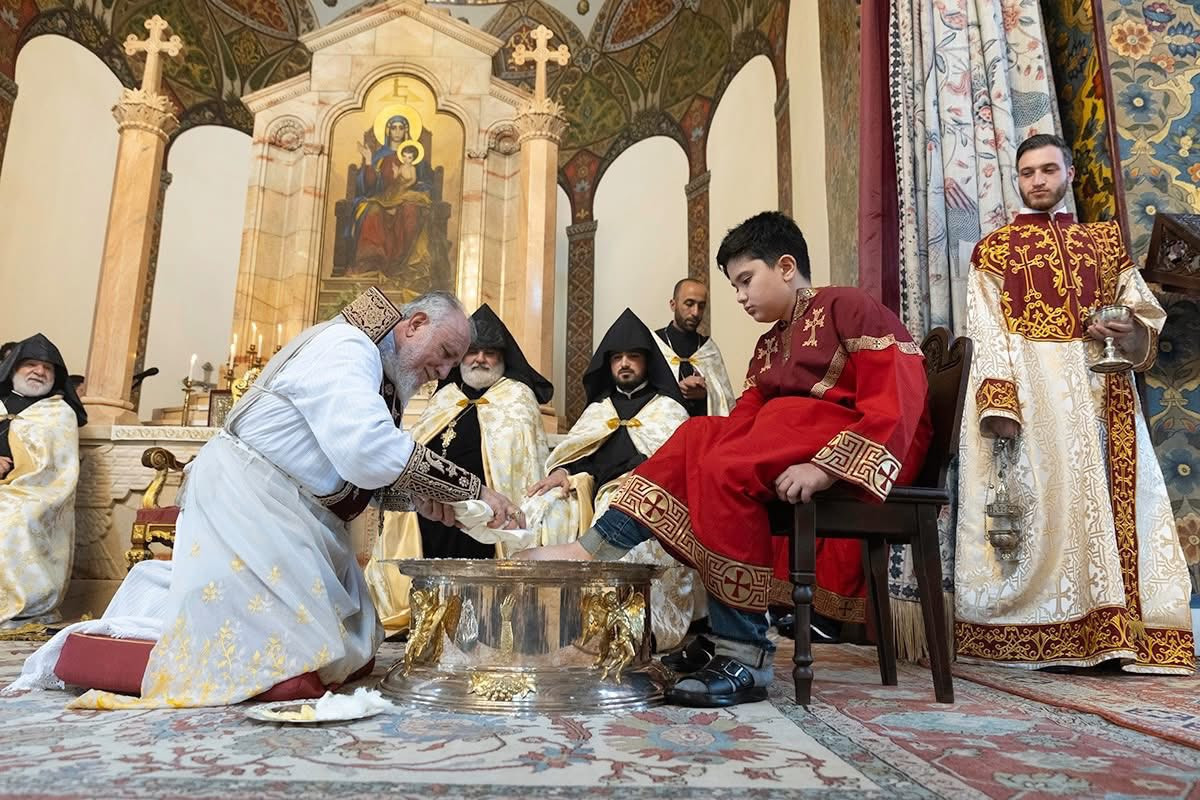 Во время священного богослужения, после чтений из Священного Писания, Его Святейшество благословил воду и масло, возложенные на Святой Престол. Затем, следуя примеру Единородного Сына, под пение духовных гимнов Католикос Всех Армян преклонил колена, омыл и помазал елеем ноги представителей монашествующего духовенства Первопрестольного Святого Эчмиадзина и мирян: преосвященного епископа Вагана Ованнисяна; преподобного отца иеромонаха Маштоца Мхитаряна; достօчтимого диакона Армана Манукяна; студентов Духовной семинарии Геворгян — диакона Давида Гамбаряна и чтеца Армена Григоряна; студентов богословского факультета Ереванского государственного университета — Давида Григоряна и Артура Манукяна; военнослужащих срочной службы Министерства обороны Республики Армения — Хачика Минасяна и Гора Геворгяна; учащихся средней школы “Эорнекян” — Амбарцума Ханзадяна и Мгера Авагяна, и более младших детей — Огана Оганяна, Спартака Гаспаряна, Давида и Тиграна Петросянов.