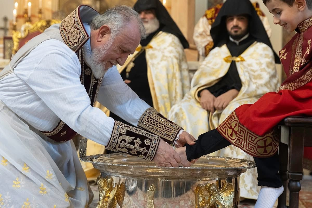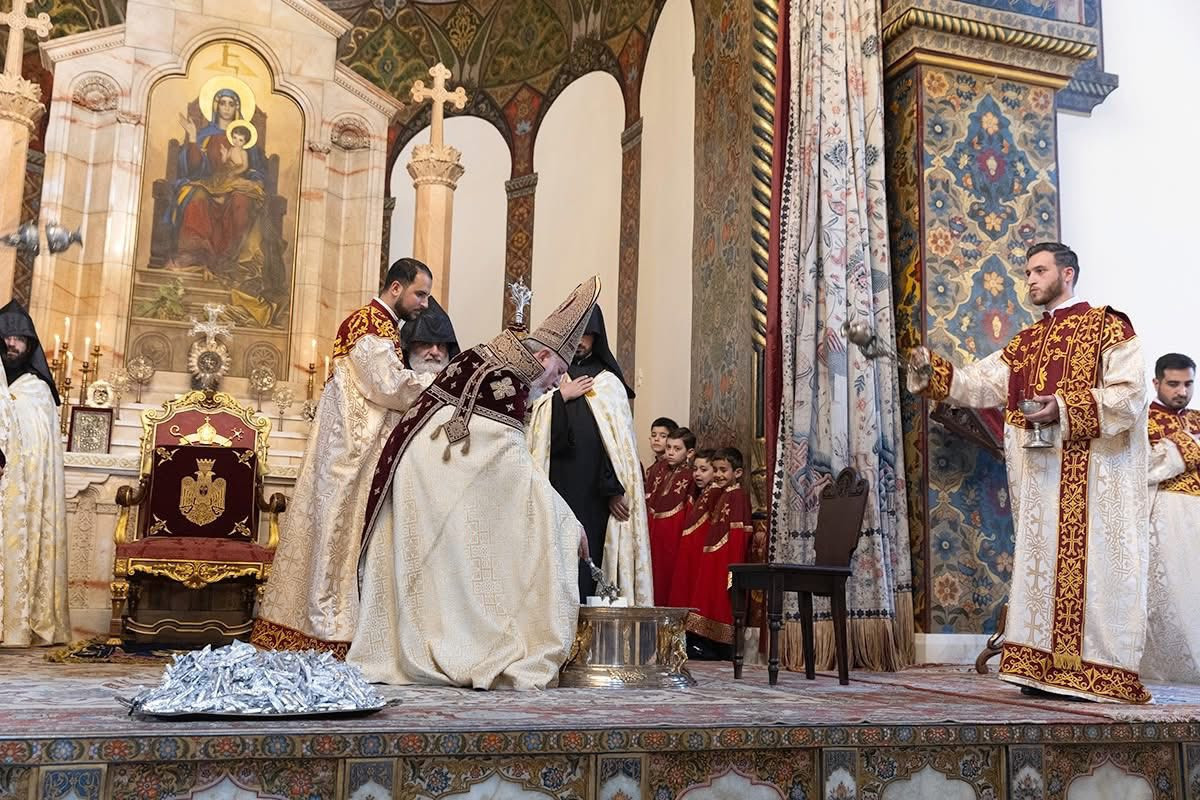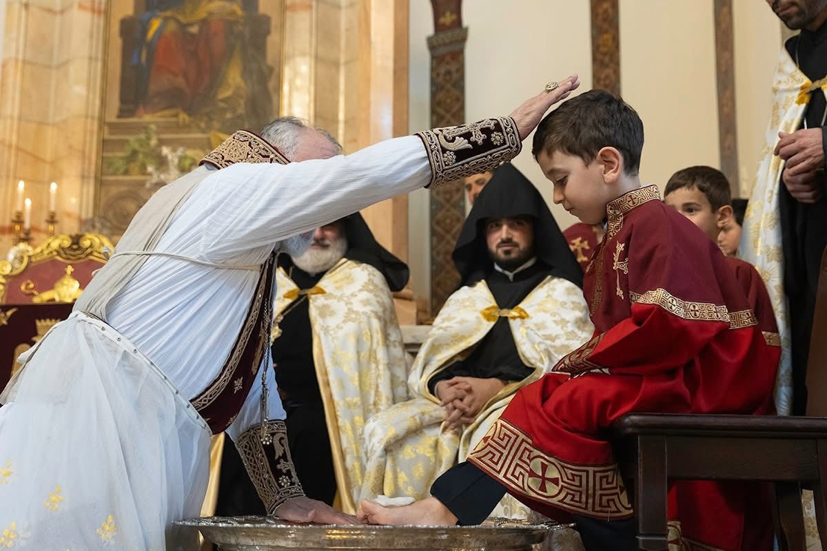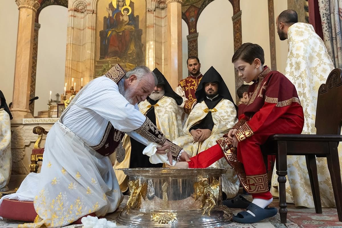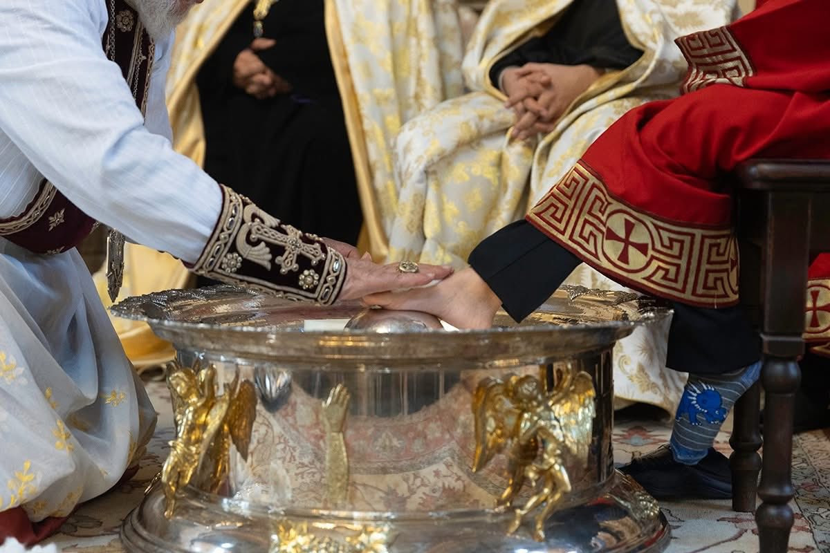 Во время священного богослужения, после чтений из Священного Писания, Его Святейшество благословил воду и масло, возложенные на Святой Престол. Затем, следуя примеру Единородного Сына, под пение духовных гимнов Католикос Всех Армян преклонил колена, омыл и помазал елеем ноги представителей монашествующего духовенства Первопрестольного Святого Эчмиадзина и мирян: преосвященного епископа Вагана Ованнисяна; преподобного отца иеромонаха Маштоца Мхитаряна; достօчтимого диакона Армана Манукяна; студентов Духовной семинарии Геворгян — диакона Давида Гамбаряна и чтеца Армена Григоряна; студентов богословского факультета Ереванского государственного университета — Давида Григоряна и Артура Манукяна; военнослужащих срочной службы Министерства обороны Республики Армения — Хачика Минасяна и Гора Геворгяна; учащихся средней школы “Эорнекян” — Амбарцума Ханзадяна и Мгера Авагяна, и более младших детей — Огана Оганяна, Спартака Гаспаряна, Давида и Тиграна Петросянов.