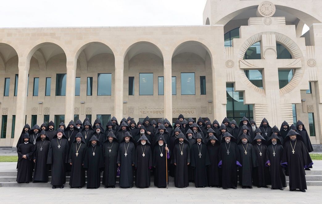 В условиях многочисленных вызовов, стоящих перед нашей Родиной и Церковью, мы, монашеское духовенство Первопрестольного Святого Эчмиадзина, поддерживаемые конгрегатствами Престольных кафедр Армянской Церкви - Католикосата Великого Дома Киликийского, Патриархатов Иерусалимского и Константинопольского, как неусыпные служители Всемогущего Бога и духовные пастыри благочестивого армянского народа, с осознанием высокой ответственности нашего призвания, единые в помыслах и действиях, будем и впредь самоотверженно служить исторической миссии Армянской Церкви по спасению и укреплению нашей нации во славу Армянской Апостольской Святой Церкви и во благо нашей родной страны Армении.