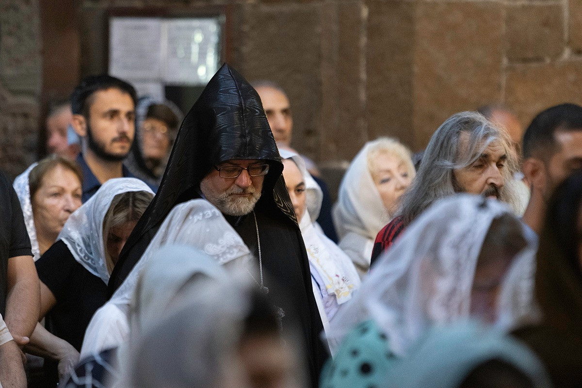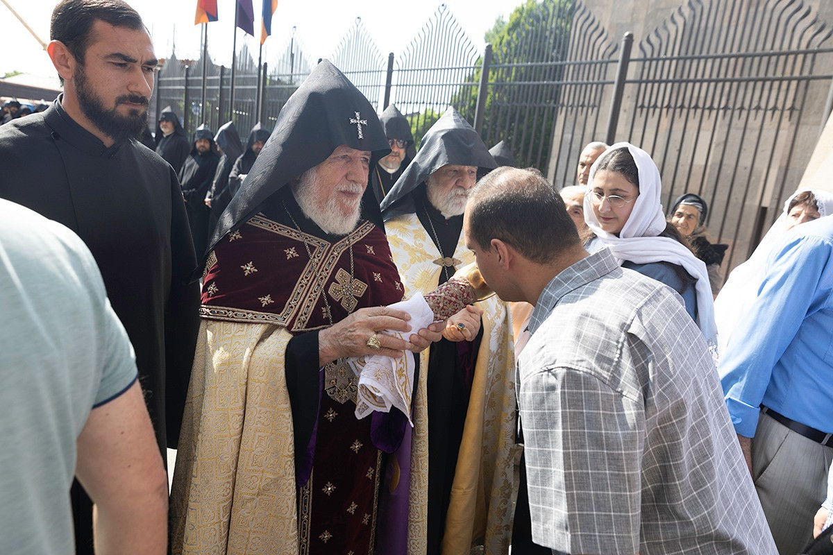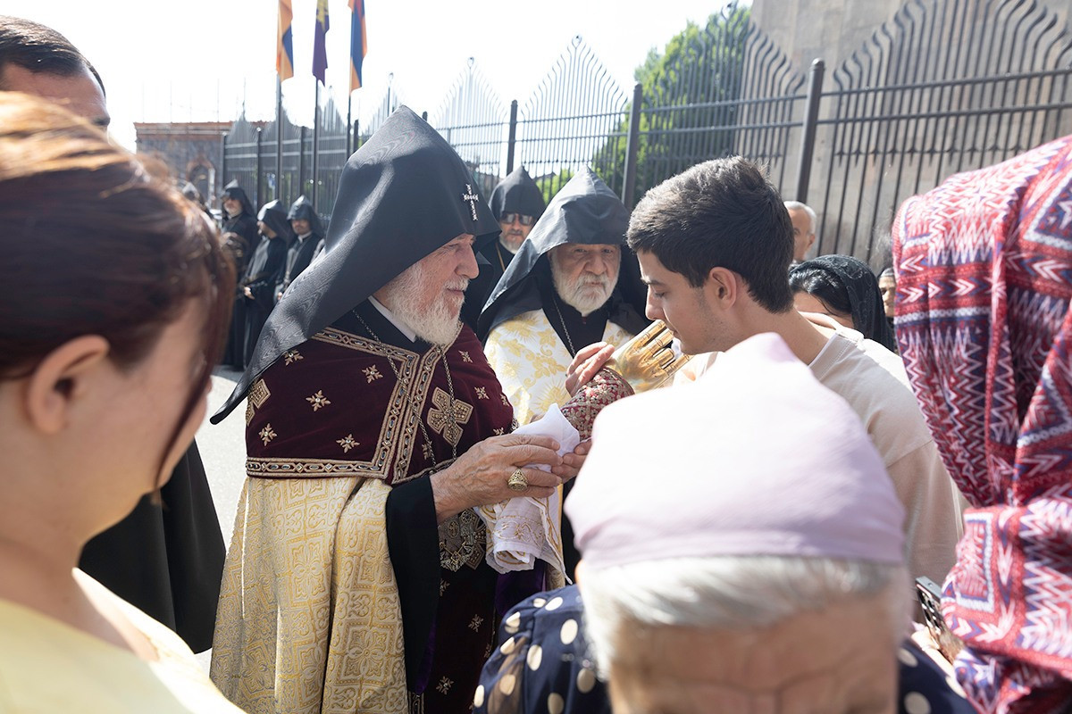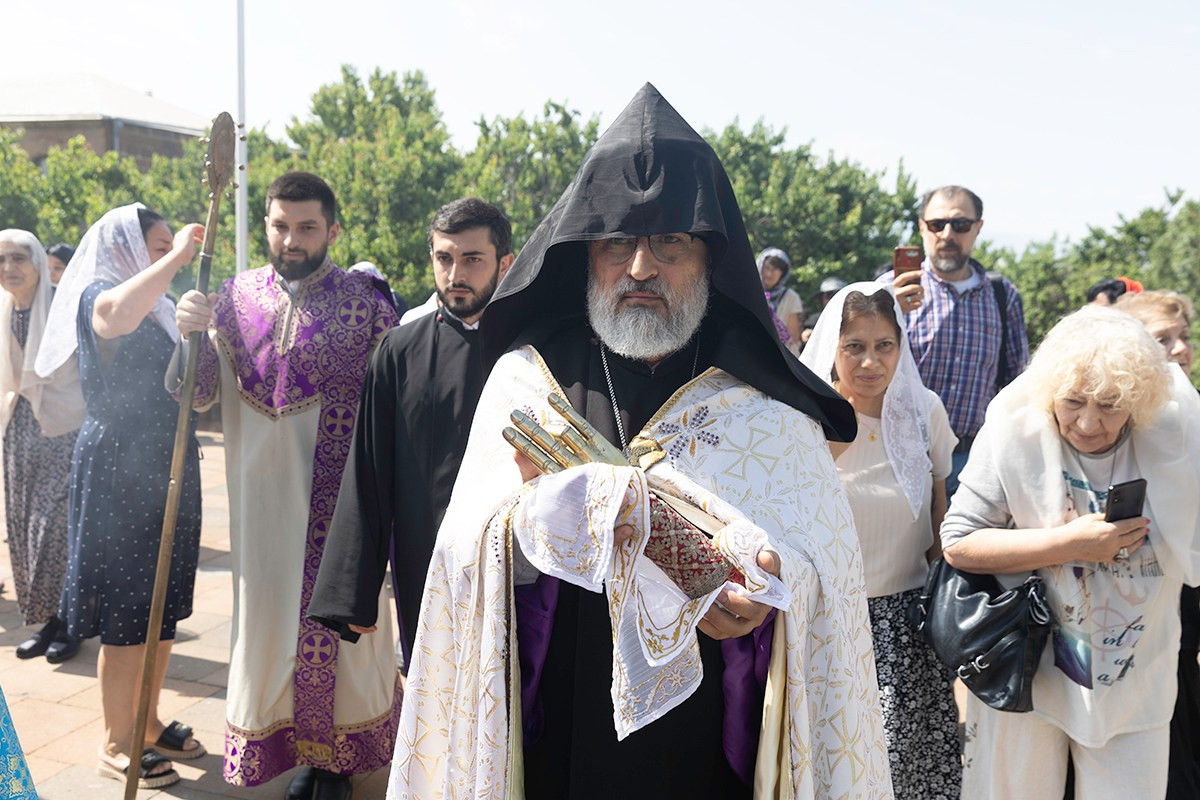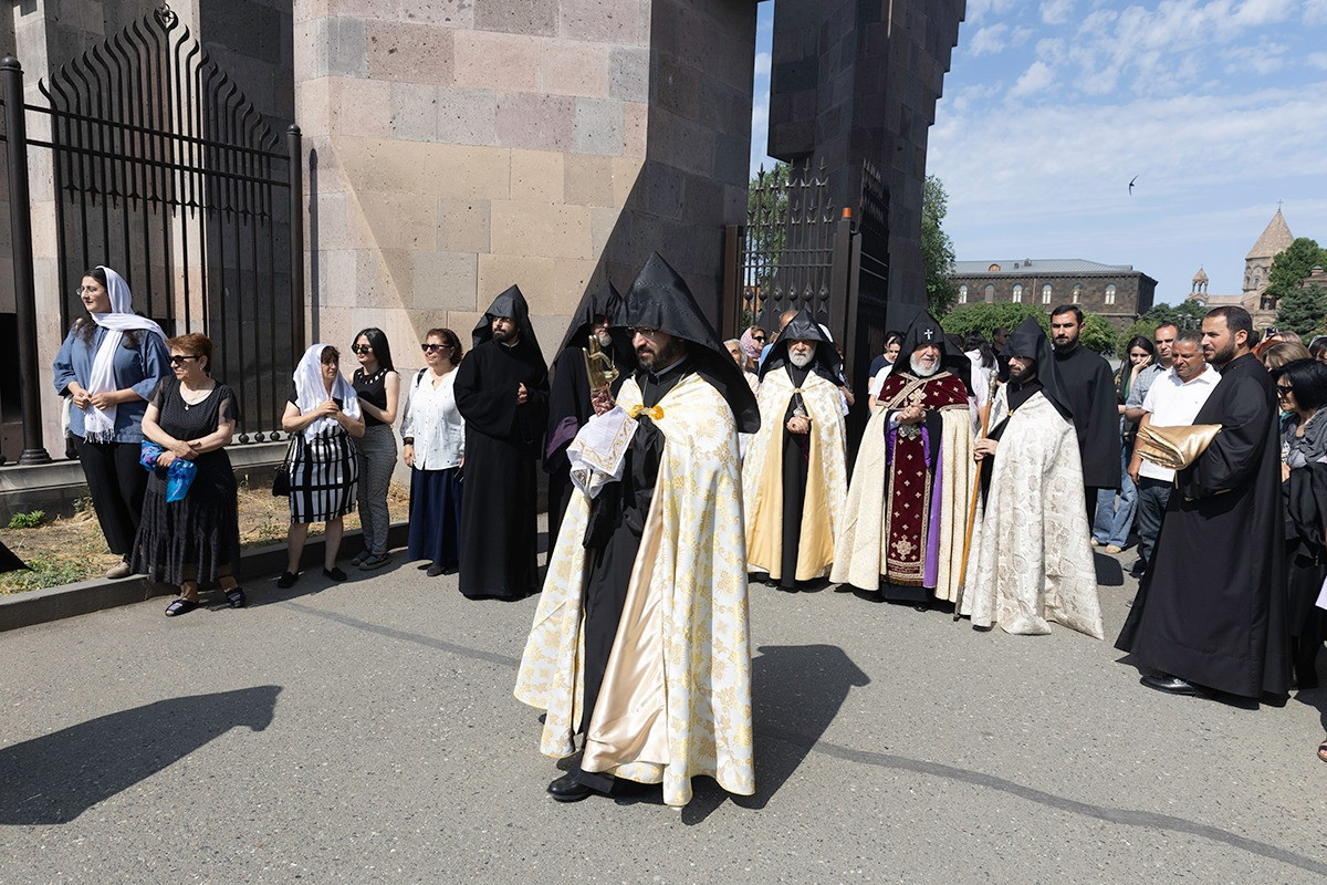 У входа в монастырь Святой Рипсиме процессия была встречена прибывшими из разных уголков Армянии многочисленными паломниками и духовенством обители во главе с Преосвященным епископом Артаком Тиграняном, игуменом монастырей Первопрестола.