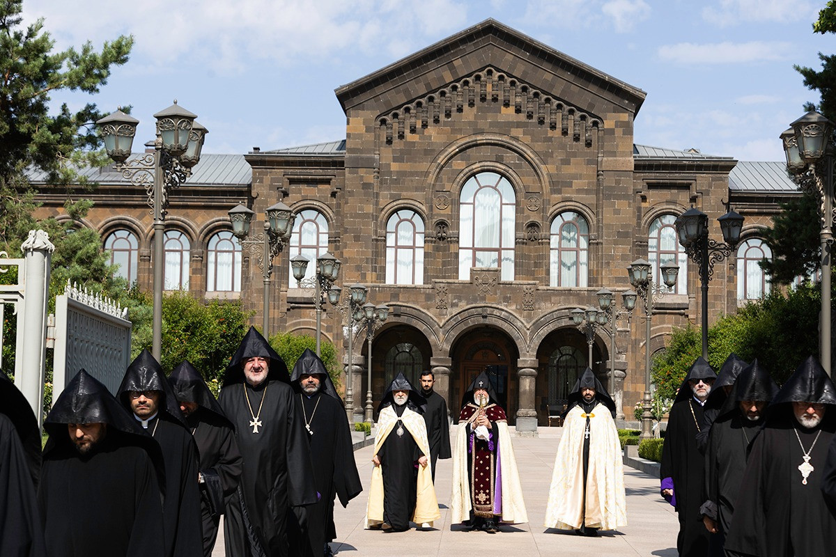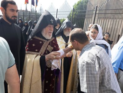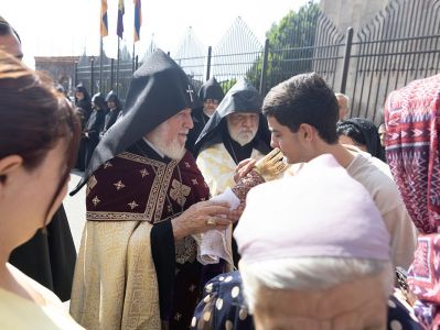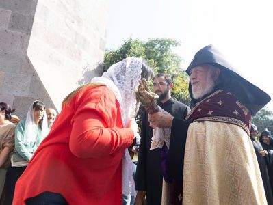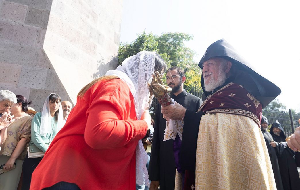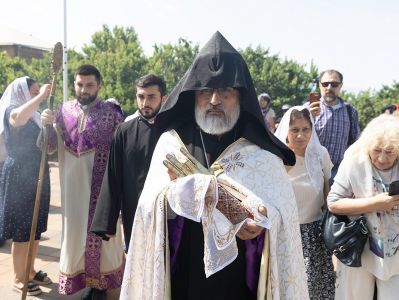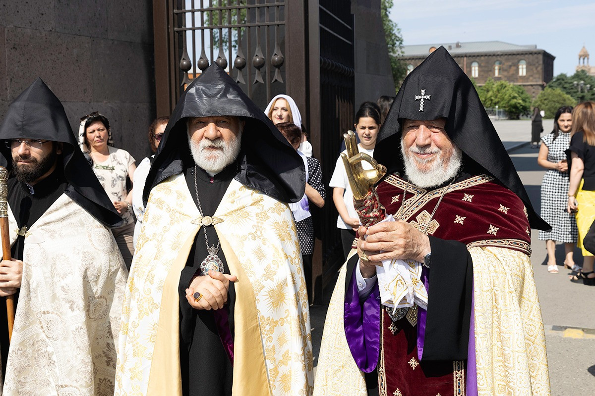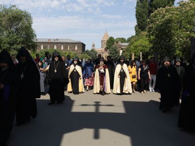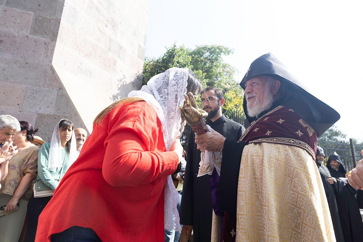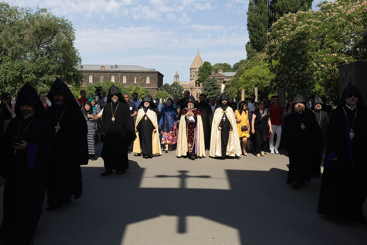 У входа в монастырь Святой Рипсиме процессия была встречена прибывшими из разных уголков Армянии многочисленными паломниками и духовенством обители во главе с Преосвященным епископом Артаком Тиграняном, игуменом монастырей Первопрестола.