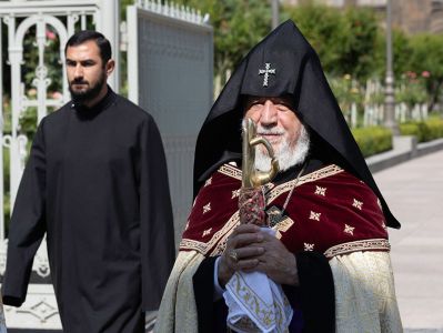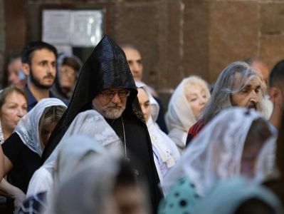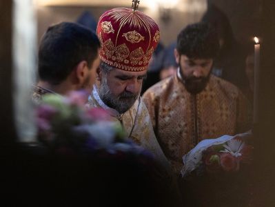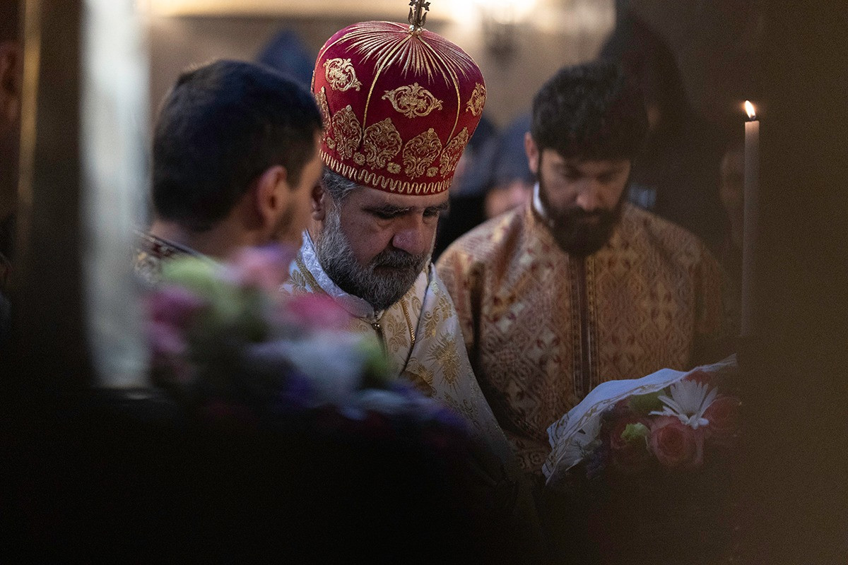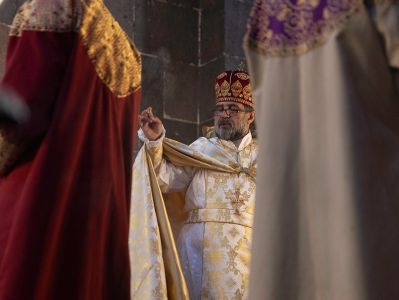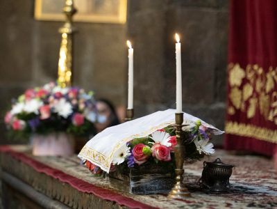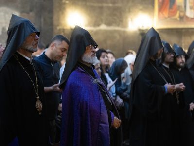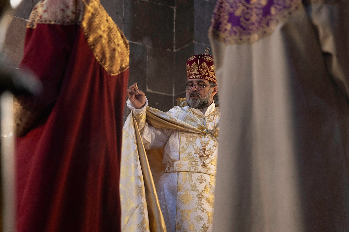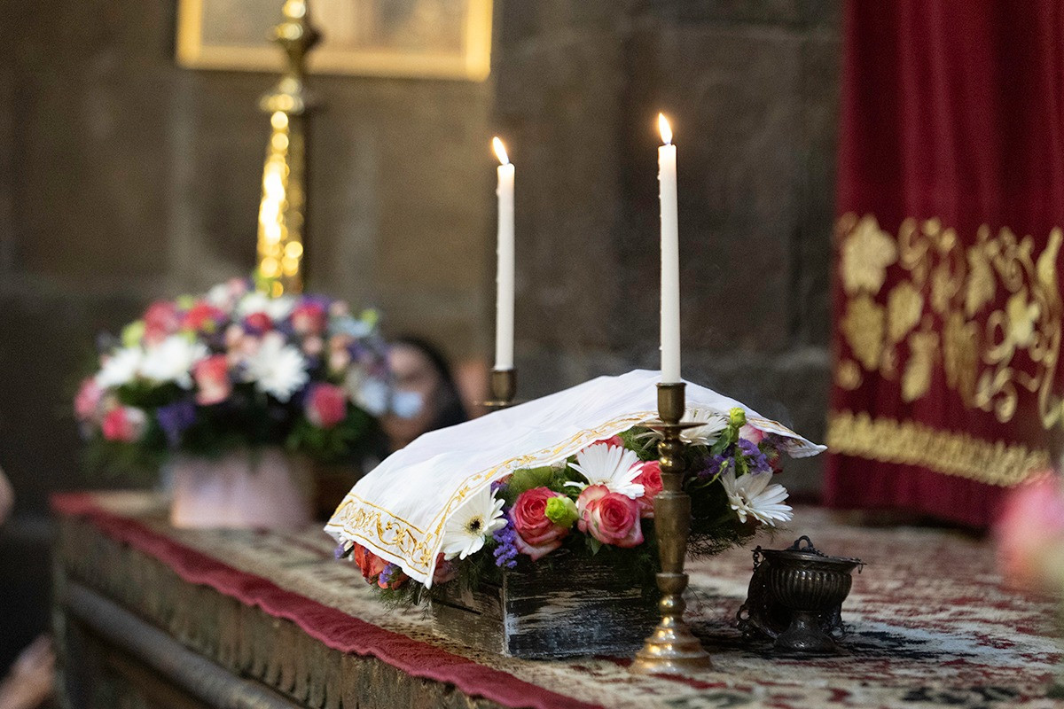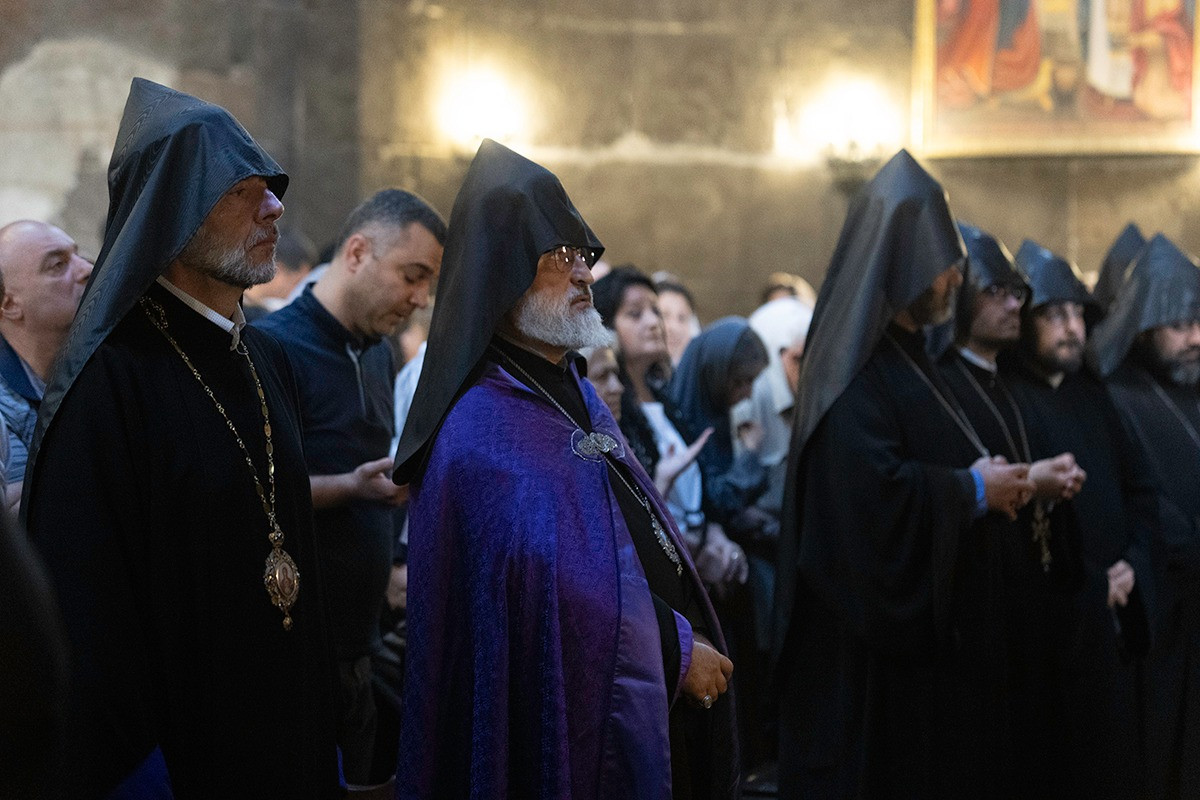 У входа в монастырь Святой Рипсиме процессия была встречена прибывшими из разных уголков Армянии многочисленными паломниками и духовенством обители во главе с Преосвященным епископом Артаком Тиграняном, игуменом монастырей Первопрестола.